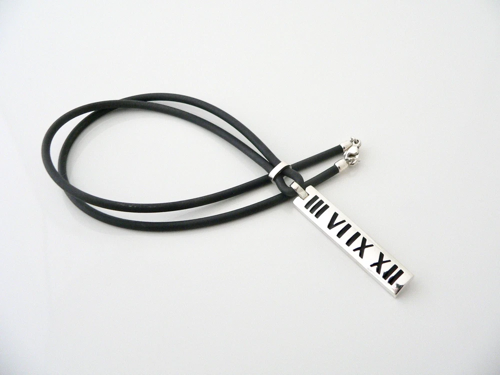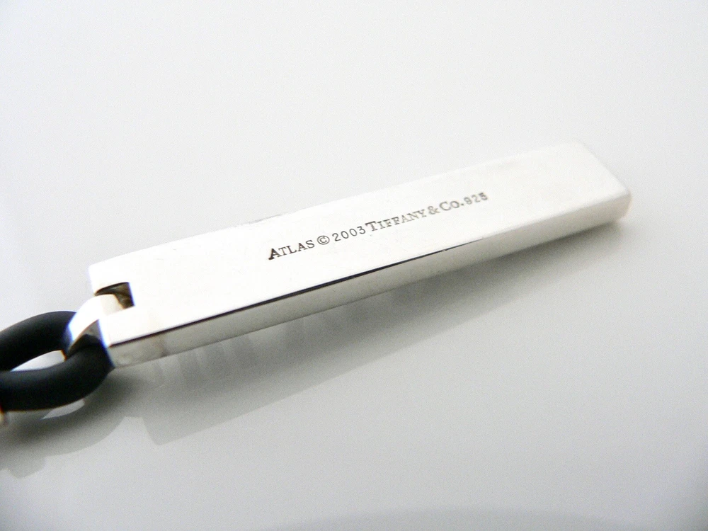 Overview: Offered for sale is a wonderful and very cool Tiffany & Co. Sterling Silver and Black Enamel Atlas Bar Surfer Necklace on a Black Rubber Cord. Definitely a Tiffany piece that you will get your money's value for. Hanging from its gorgeous black rubber cord is a beautiful Black Enamel Atlas bar charm. The necklace works perfectly with pretty much any attire your put on, AND is an awesome statement piece. It is the perfect necklace that fits a lifestyle on the go -- it can be worn to pretty much any occasion! It is simple, elegant, and classic all rolled into one necklace. Imagine wearing the necklace with your office attire... now imagine it with jeans or weekend wear ... Perfect anytime! No longer in production, it is perfect for the collector. It is a perfect Tiffany piece to start or add to your collection. As always, the item is hallmarked and is guaranteed to be 100% authentic. Wonderful present for yourself or anyone you love! Will surely delight! Particulars: Size & Measurements: The Rubber Cord is 16 inches from end to end. The Atlas bar charm is 1.6 inches long. Metal & Hallmarks: 2003 / Atlas / Tiffany & Co. / 925 Solid 925 sterling silver Please check out my other unique and interesting Tiffany items on sale.