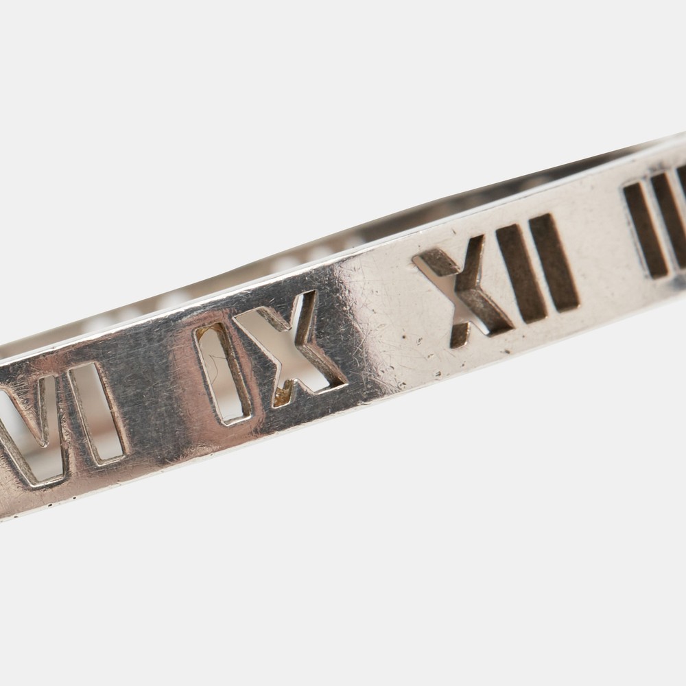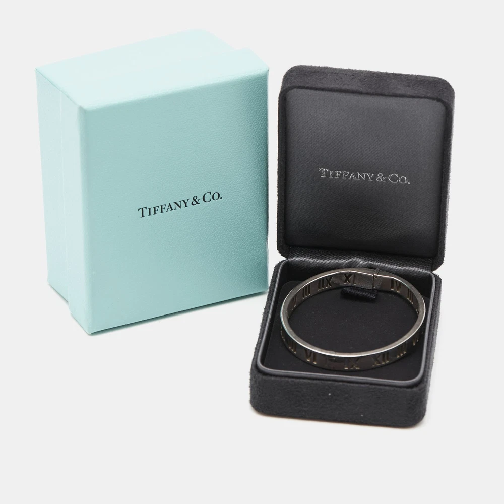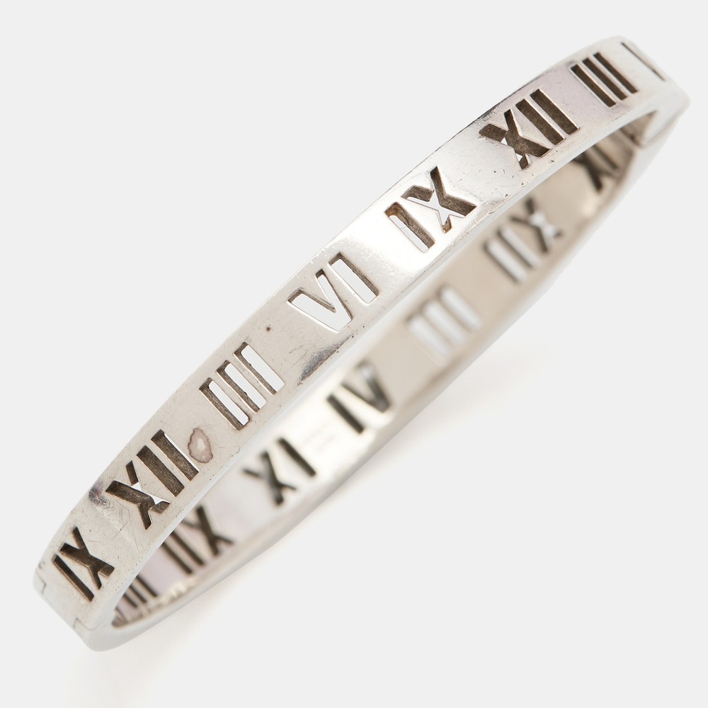 This Tiffany and Co. Atlas bangle is crafted from sterling silver and designed with the iconic Roman numeral motif. Perfect for stacking or wearing solo, this piece epitomizes timeless elegance and meticulous craftsmanship.Certified by The Luxury Closet - This item has gone through a detailed authentication process overseen by our experts. We offer a lifetime guarantee of authenticity on all our items. Import duties, taxes and charges are not included in the item price. These charges are the buyers responsibility. Please check with your country’s customs office to determine what these additional cost will be prior to buying. Our eBay Store About Us Contact Us Add to Favorite Sellers Tiffany & Co. Atlas Sterling Silver Bangle Bracelet $465.3 This Tiffany and Co. Atlas bangle is crafted from sterling silver and designed with the iconic Roman numeral motif. Perfect for stacking or wearing solo, this piece epitomizes timeless elegance and meticulous craftsmanship. Product Details Brand Color Silver Dimensions Width: 0.63 cm Material Size Outsole Width Outsole Length Heel Height Includes Original Box, Original Case Certified by The Luxury Closet This item has gone through a detailed authentication process overseen by our experts. We offer a lifetime guarantee of authenticity on all our items. How We Check The in-house team of experts at The Luxury Closet is highly trained to verify the authenticity and the condition of the luxury products. They ensure that only 100% authentic items are put on sale.The evaluation process is unique with its own mix of assessment criteria and differs according to the category. Each item is evaluated based on the following combination of hallmarks, hardware, stitching, symmetry, material, craftsmanship, stamping, codes, hologram stickers, and packaging. Our authenticators also check if the items have been modified or amended (e.g., aftermarket diamonds, replaced batteries, repaired bags, etc.) International Buyers Import duties, taxes and charges are not included in the item price. These charges are the buyers responsibility. Please check with your country’s customs office to determine what these additional cost will be prior to buying.