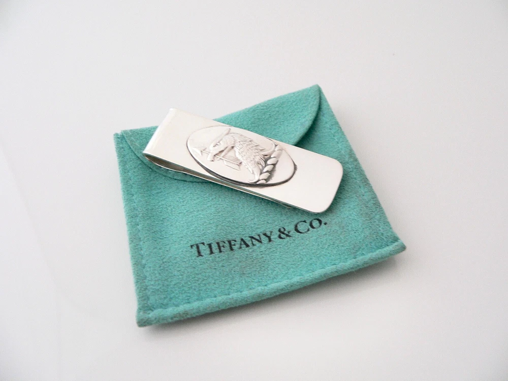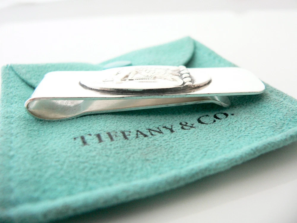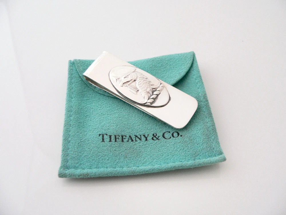 Overview: Offered for sale is a very rare and unique Tiffany and Co. Sterling Silver Eagle Arrow Money Clip. Very cool, retro piece that is sure to be a conversation starter! The money clip is in great condition. It will certainly be something that will be used on a daily basis. The clip is no longer in production, making it a great piece for the collector. Perfect surprise for that someone special! The piece is fully hallmarked and is guaranteed to be 100% authentic. It will come with its Tiffany pouch as shown! Perfect and ready for gifting! (The pouch does have some smudges - please see pics) Wonderful present for yourself or anyone you love! Will surely delight! Particulars: The money clip is approx 2.25 inches long. Metal & Hallmarks: Tiffany & Co. Makers / Sterling Solid 925 sterling silver Please check out my other unique and interesting Tiffany items on sale.