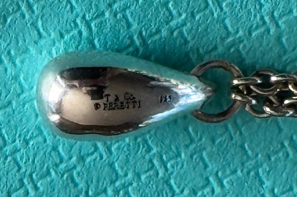 Tiffany & Co. Elsa Peretti 5 Tear Drop Necklace. Measures approx. 16" . Sterling Silver 925. No box or pouch. All Our Tiffany & Co. Items are Authentic.