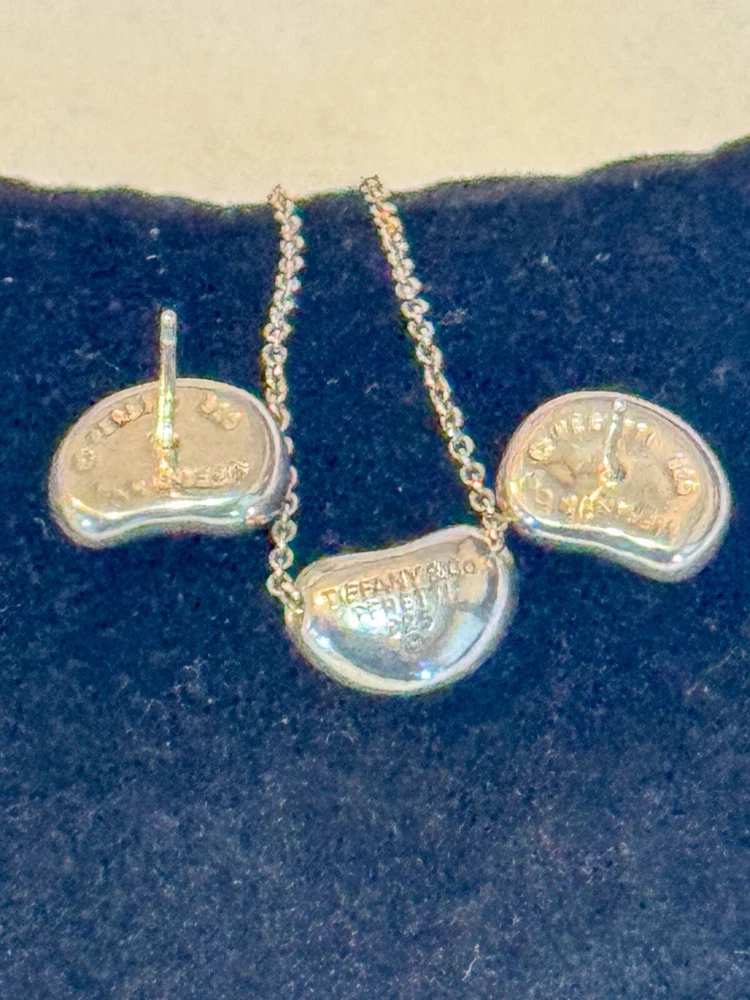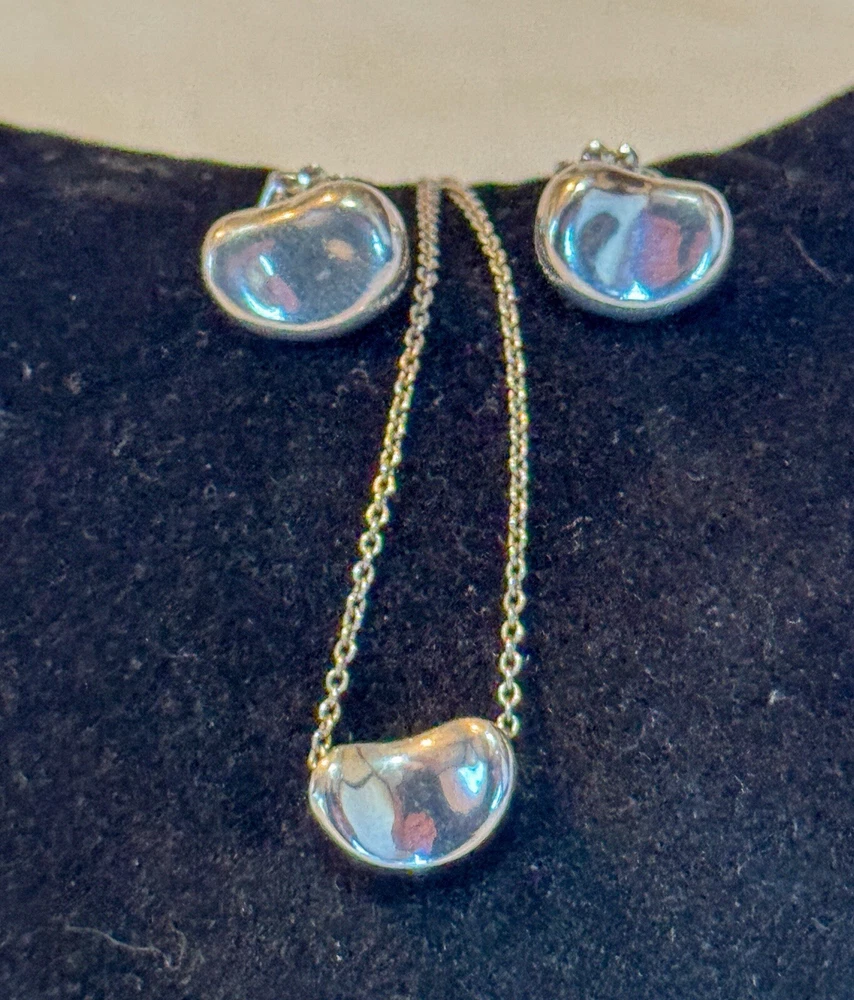 Just in time for Christmas!! Elevate your jewelry collection with the exquisite Tiffany & Co. Silver Elsa Peretti Bean Necklace and Earrings set. Crafted from high-quality .925 silver, this elegant ensemble features a beautifully designed bean pendant on a 16-inch chain, offering a delicate yet striking look. The total weight of the set is 8.22 grams, ensuring a lightweight feel while maintaining a luxurious presence. The necklace pairs perfectly with matching earrings, each showcasing the iconic bean shape that symbolizes beauty and simplicity. This set comes beautifully packaged in a Tiffany & Co. box along with a jewelry pouch, making it an ideal gift for yourself or a loved one. Embrace timeless elegance with this stunning Tiffany & Co. jewelry set.