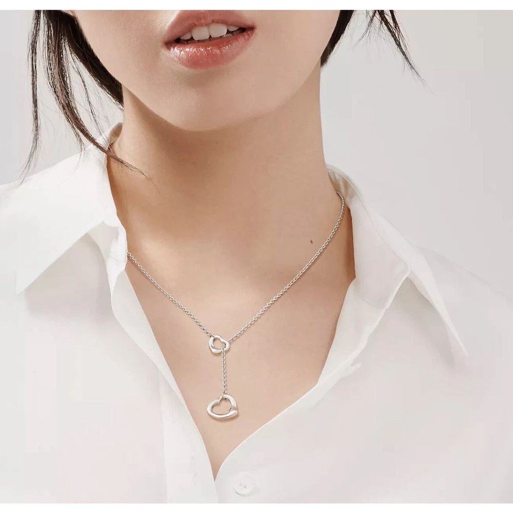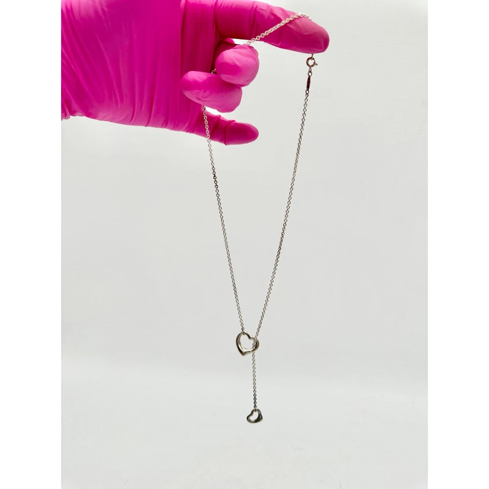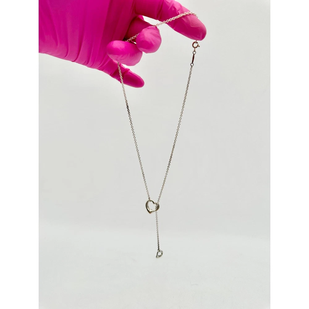 Tiffany & Co. Elsa Peretti Open Heart Lariat Sterling Silver Necklace - The simple evocative shape of the Elsa Peretti open heart designs celebrates the spirit of love ( from Tiffany & CO.) - 16 mm, 19.5" chain length - Sterling - Small amount of tarnish(shown) on part of chain from sitting unused, but will come off with a good cleaning - Never worn - Will come with Tiffany drawstring bag KEYWORDS: luxury designer jewelry heart tiffany