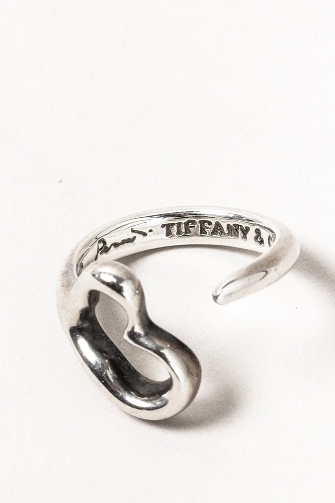 Celebrating the spirit of love, the Open Heart ring from Tiffany & Co. Elsa Peretti is crafted in a sterling silver, and its simple and evocative cutout heart is a timeless and elegant design. Size: 5 Condition: Excellent; very light tarnishing on edge of heart. Comes with dustbag. Approximate Measurements: Circumference: 2” (5 cm) Composition: Sterling silver.