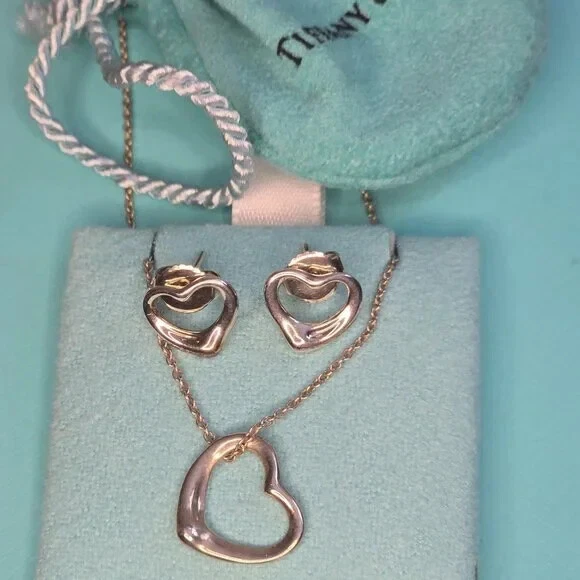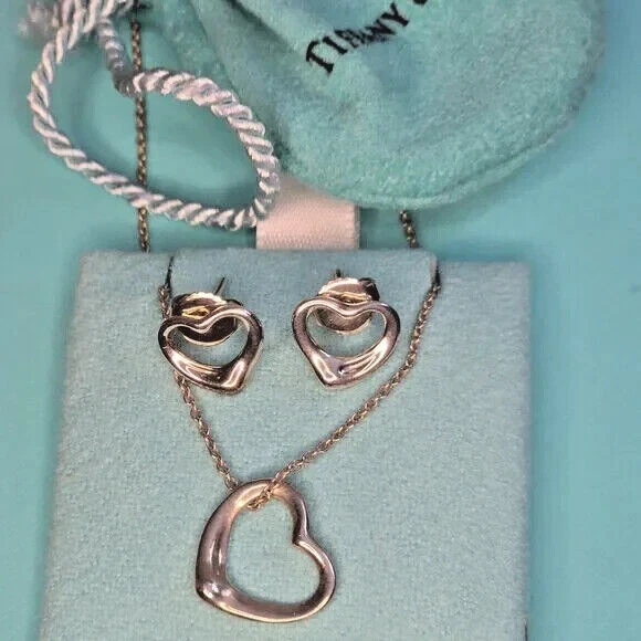 Tiffany & Co Elsa Peretti Sterling Silver Heart Earrings Necklace Set