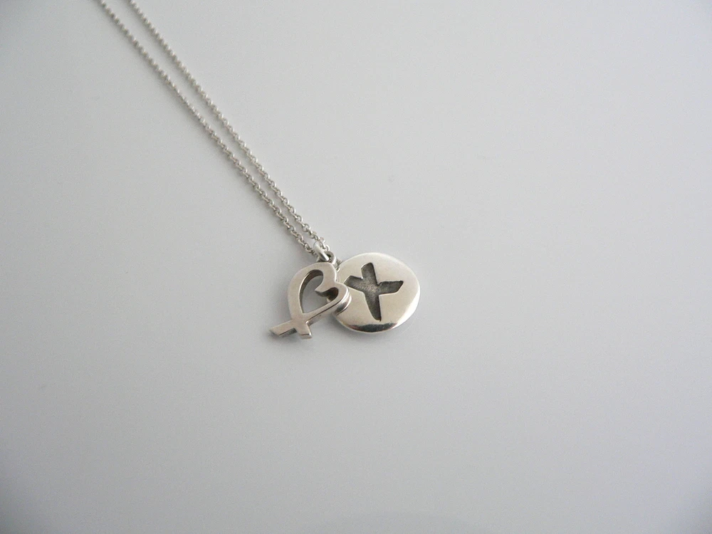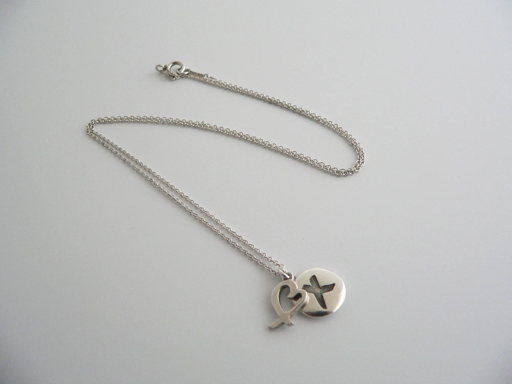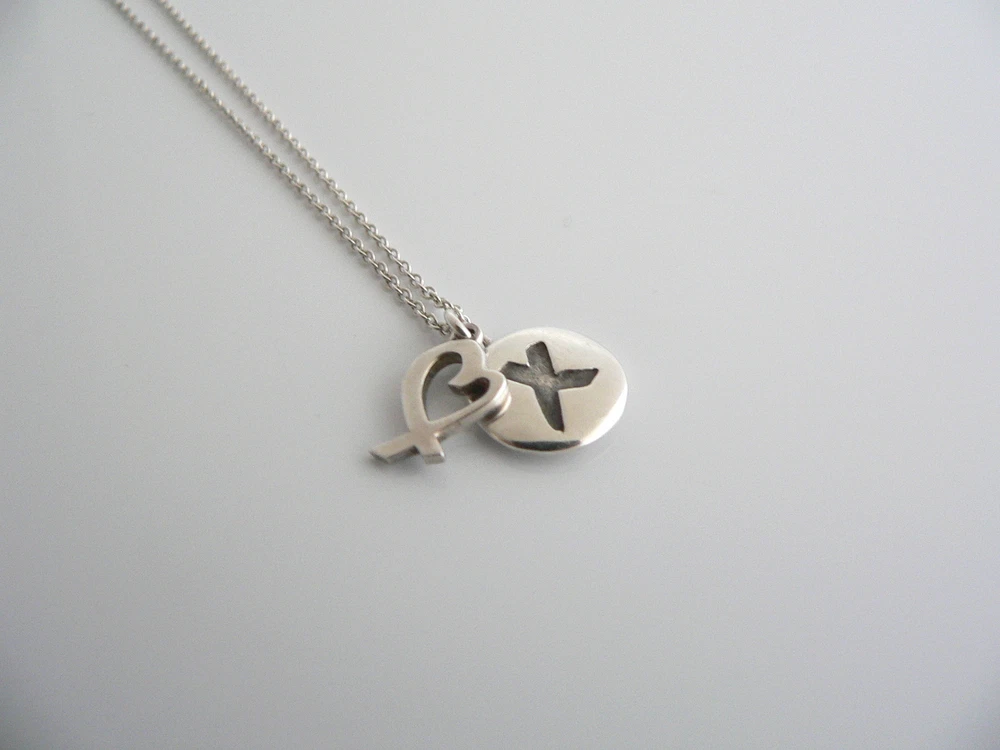 Overview: Everyone needs a signature Tiffany piece! Here is the perfect one just for you - and it is quite a rare and hard to find piece. Offered for sale is a wonderful Tiffany & Co. Sterling Silver Paloma Picasso Loving Heart & "X" / Kiss Circle necklace. The piece is crafted from bright and substantial Tiffany silver, yet retains its feminine and delicate feel. Hanging from the sterling silver Tiffany chain is a very cool and cute Love / Heart & "X" or "Kiss" Circle pendants/charms. Very unique indeed! You will be one of the few to own this piece, for sure! It is a wonderful necklace that fits a lifestyle on the go, and can be worn to almost any occasion. The piece is simple, elegant, and classic all rolled into one. Imagine it with your professional office attire ... Now imagine it with jeans or weekend wear ... Perfect! It is one of THE classic Tiffany piece to start or add to your collection. As always, the item is fully hallmarked and guaranteed to be 100% authentic. Wonderful present for yourself or anyone you love! Will surely delight! Particulars: Size & Measurements: The necklace is 17 inches from end to end. Metal & Hallmarks: T & Co. / Paloma Picasso / 925 Solid 925 sterling silver Please check out my other unique and interesting Tiffany items on sale.