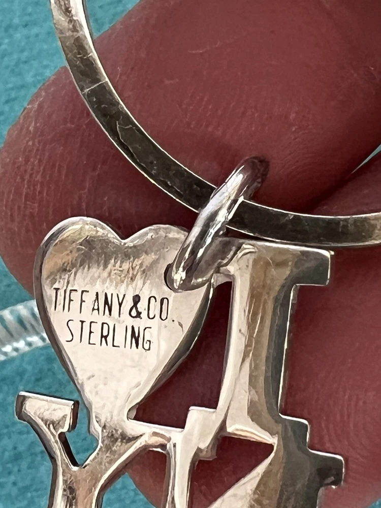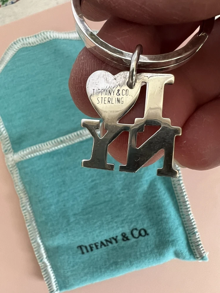 This is a Tiffany & Co. key ring made of 925 sterling silver. It features an "I Love NY" charm, making it a stylish accessory that represents love. The key ring comes with a pouch for safekeeping.
