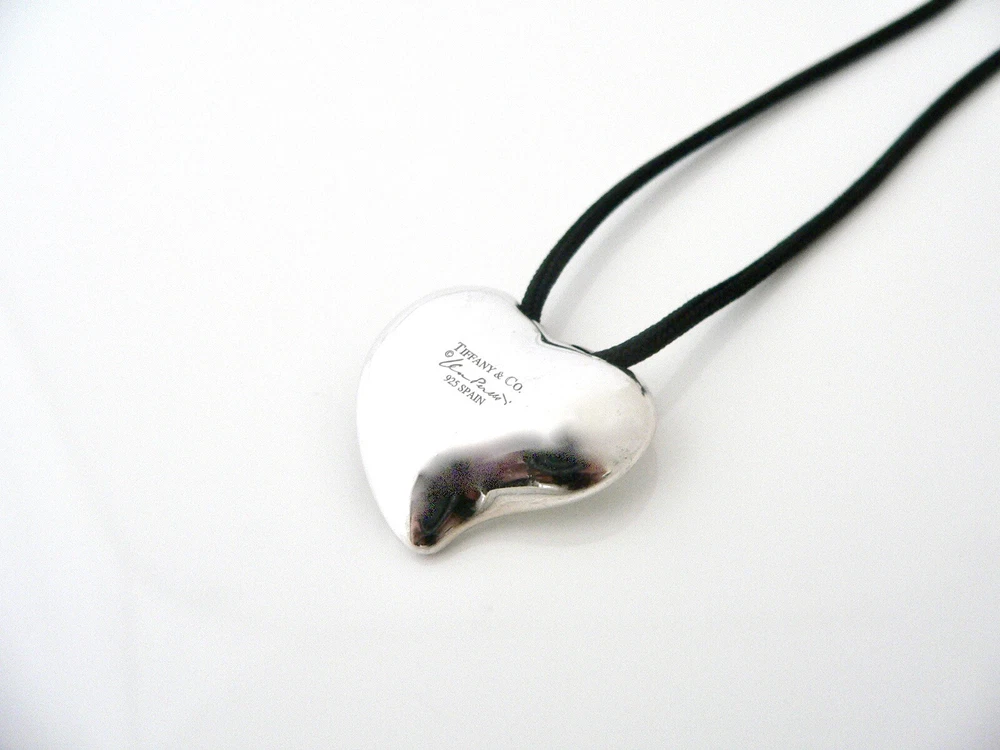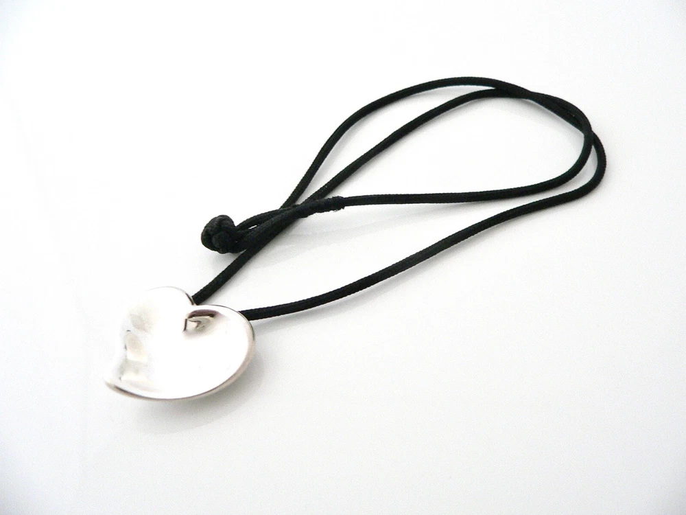 Overview: NOTE: This item is on clearance due to a slight defect. The end of the cord has frayed so the opening is a bit bigger. The necklace is still wearable as it is. This is also is not visible when worn. The heart charm is in excellent condition! Great bargain on an awesome piece ! Offered for sale is a wonderful Tiffany classic. Whether you are just starting your Tiffany collection or are thinking of adding another piece, this one is perfect for you. This Gorgeour Carved Heart charm on an 17 Inch Silk Cord is a Tiffany classic that will never go out of style. The piece makes a "Tiffany" statement in its own subtle/simple way. It will most certainly be a piece that you will turn to over and over again, making it great value for your money. It is a wonderful necklace that fits a lifestyle on the go -- the piece can be worn to almost any occasion! It is simple, elegant, and classic all rolled into one. Imagine the piece with your professional office attire ... Now imagine it with jeans or weekend wear ... Very cool in every way! As always, the item is fully hallmarked and guaranteed to be 100% authentic. Wonderful present for yourself or anyone you love! Will surely delight! Particulars: Size & Measurements: The necklace is approx. 17 inches from end to end. The Large Heart charm is approx. 1 inch long and 1.1 inches at its widest ends. Metal & Hallmarks: Tiffany & Co. / Elsa Peretti / 925 / Spain Solid 925 sterling silver Please check out my other unique and interesting Tiffany items on sale.