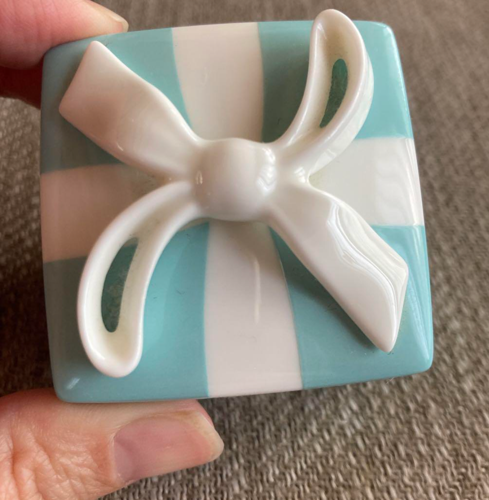 TIFFANY & CO Mini Blue Bow Trinket Gift Box Porcelain Ribbon Made in Japan Description Embrace the elegance of Tiffany & Co. with this exquisite Mini Blue Bow Trinket Gift Box. Crafted from fine porcelain, this small, square box features a glossy finish and a stunning blue hue that captures the eye. The box is adorned with a beautifully detailed porcelain ribbon, adding a touch of sophistication to any collection. Ideal for all occasions, this trinket box serves as a charming home for your cherished keepsakes. Measuring 1.5 inches in height and 2 inches in width, it's the perfect size for storing rings, earrings, or other precious items. Whether it's a personal treat or a thoughtful gift, this original piece, made in Japan, is sure to delight. Shipping We will ship by DHL or FedEx or Japan Post International Buyers - Please Note: Import duties and taxes are not included in the item price or shipping cost. Please check with your country?s customs office to determine these additional costs prior to bidding or buying. Additionally, if the delivery address is in a remote area, there may be additional charges by FedEx or DHL. If such charges occur, you may be asked to pay an additional $15 to $20.