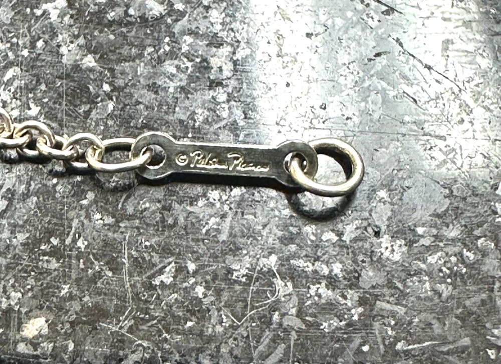 This Tiffany & Co. bracelet is from the Paloma Picasso collection, made of sterling silver with an olive vine leaf design. It measures 7 inches in length, features a spring ring closure, and is signed by the brand. DOES NOT COME WITH BOX OR PAPERS