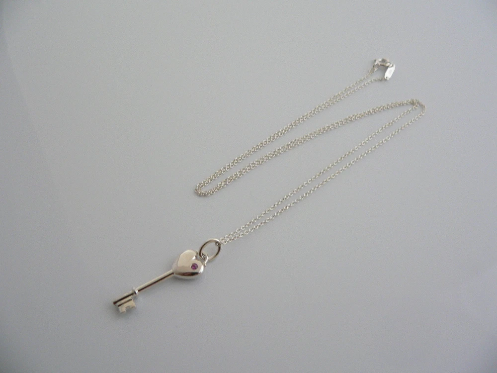 Overview: Offered for sale is a fantastic and very pretty Tiffany and Co. Sterling Silver and Pink Sapphire Heart Key Necklace. Wonderful necklace that fits a lifestyle on the go -- the necklace can be worn to almost any occasion! Hanging from its beautiful Tiffany & Co sterling silver curb chain is a very pretty Heart Key pendant with a very pretty sparkling Pink Sapphire on one side. It is simple and yet looks extremely elegant. Perfect way to say "Here's the key to my heart :)" without ever having to say a word - believe me, she will know! :) Imagine the piece with your professional office attire ... Now imagine it with jeans or weekend wear ... Perfect in every way! The item is very comfortable to wear, and is in very good condition. A classic Tiffany piece to start or add to your collection. Both key pendant and chain are fully hallmarked and guaranteed to be 100% authentic. Wonderful present for yourself or anyone you love! Will surely delight! Particulars: Size & Measurements: The key pendant is 1.25 inches (including bail). The chain is 16 inches long. Metal & Hallmarks: Tiffany & Co. / 925 (on chain and key pendant) Solid 925 sterling silver Please check out my other unique and interesting Tiffany items on sale.