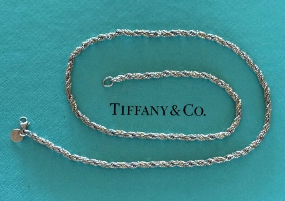 Length (inches): 18 Collection: Tiffany & Co. Rope Link Necklace Chain Type: Venetian Link Base Metal: Sterling Silver Metal Purity: 925 Gender: Unisex Secondary Stone: No Stone Seller Notes: “Excellent Condition. Please view pictures.” Brand: Tiffany & Co. Chain Style: Rope Link Personalize: No Main Stone: No Stone Features: Lobster Clasp Closure: Lobster Necklace Length: 18 in gtin13: Does not apply Color: Silver UPC: Does not apply Style: Chain Metal: Sterling Silver Type: Necklace Signed: Yes
