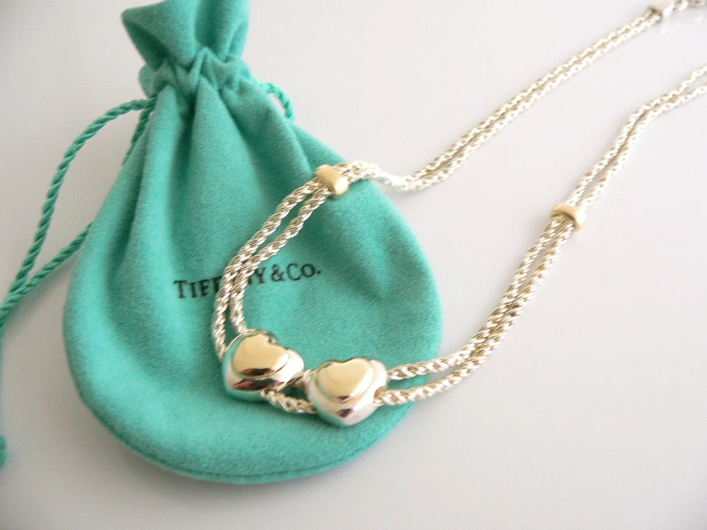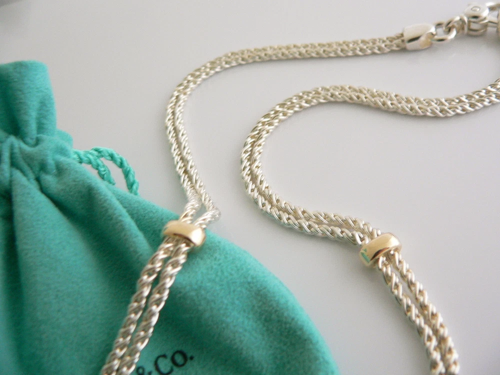Overview: Do you know which items made Tiffany a world renowned company? You just stumbled upon one of them! Offered for sale is a wonderful vintage and very rare Tiffany and Co. Sterling Silver and 18K Gold Double Rope Sliding Hearts necklace. The piece is made from solid and substantial Tiffany silver, yet has a very delicate and feminine feel to it. The necklace is very unique - hard to find and come by, so grab it while you have the chance! It is very pretty worn on its own, but would also work very well with other pieces of jewelry that you already own. It is a piece that pretty much goes with anything you can even put on ... Great piece to wear to work, or for just going to dinner with friends in jeans or a pretty dress. The necklace may be vintage but style is definitely classic Tiffany, and the details of this piece is just amazing. It is very comfortable to wear, and is in excellent condition. A great Tiffany piece to start or add to your collection. The necklace is fully hallmarked and guaranteed to be 100% authentic. It will come with its Tiffany pouch as shown! Perfect and ready for gifting! Wonderful present for yourself or anyone you love! Will surely delight! Particulars: Size & Measurements: The necklace is approximately 16.5 inches. Metal & Hallmarks: T & Co. / Italy / 925 Solid 925 sterling silver and 18K Gold Please check out my other unique and interesting Tiffany items on sale.