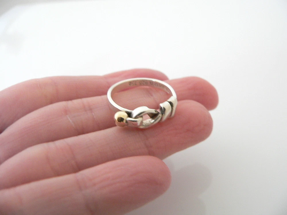 Offered for sale is a wonderful Tiffany and Co. Silver and 18K Gold Hook & Eye Ring. The piece is made from solid Tiffany silver and 18K gold, allowing you to combine the ring with almost any other piece of jewelry you already own. The style is classic Tiffany, making it a piece that you will most certainly use over and over again. Great piece to wear to work, or for just going to dinner with friends in jeans or a pretty dress. A great Tiffany piece to start or add to your collection. The item is fully hallmarked and is guaranteed to be 100% authentic. Wonderful present for yourself or anyone you love! Will surely delight! Particulars: Size & Measurements: The ring is a size 6 Metal & Hallmarks: Tiffany & Co. / 925 / 750 Solid 925 sterling silver and 18K gold Please check out my other unique and interesting Tiffany items on sale.