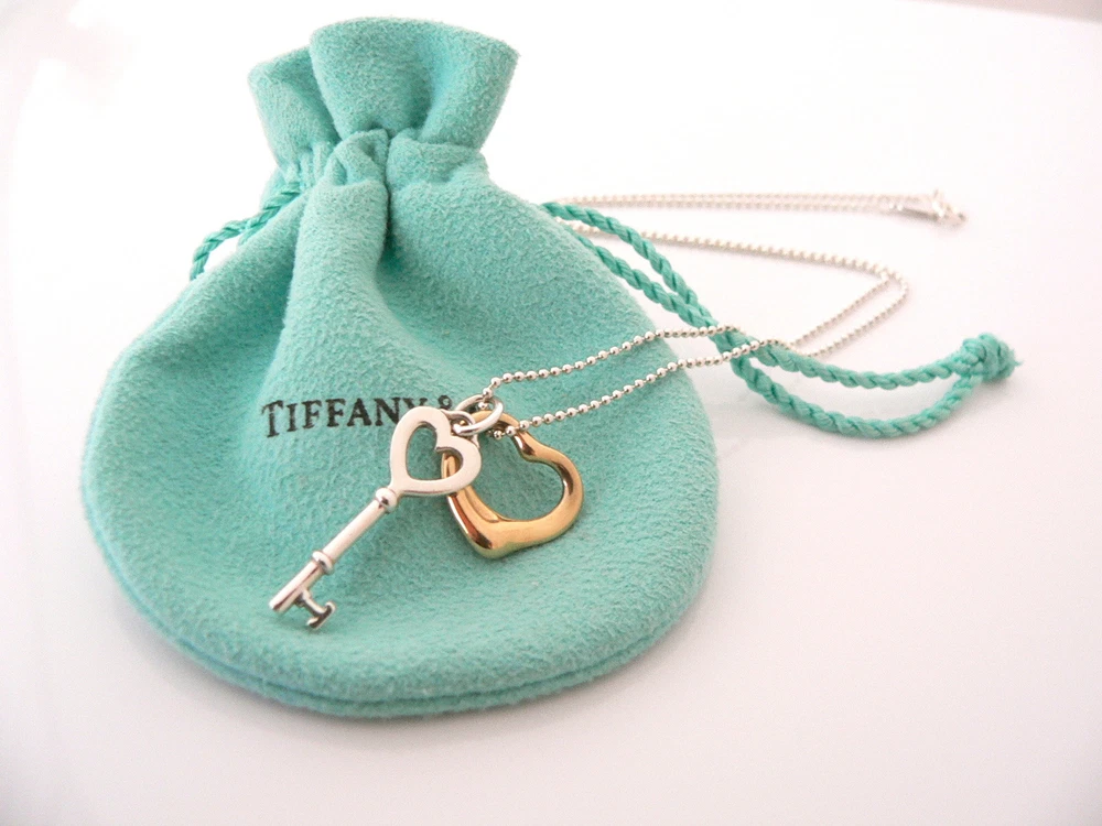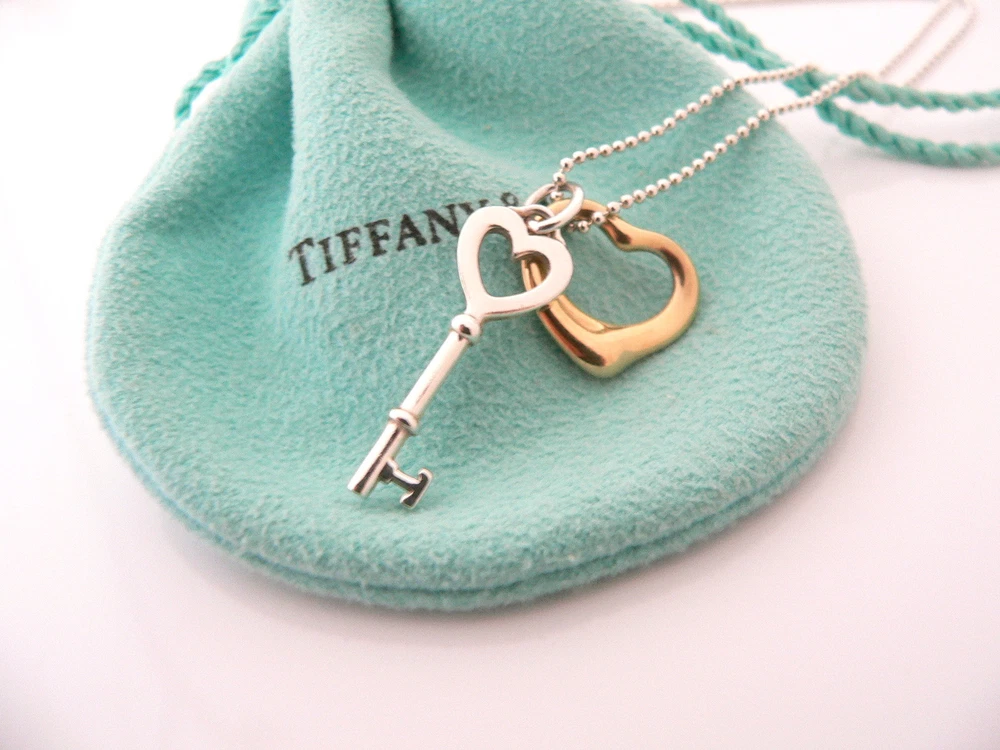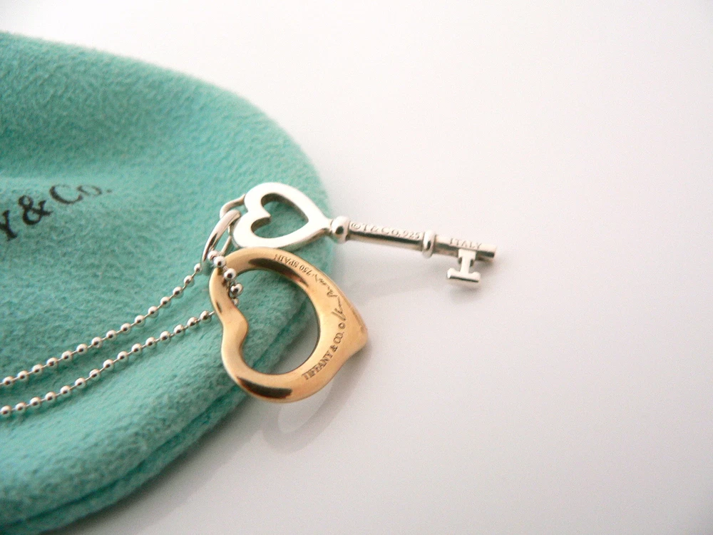 Overview: Offered for sale is a fantastic, very elegant, and super pretty Tiffany and Co. Silver Heart Key & 18K Gold Open Heart Combination Necklace. Wonderful necklace that fits a lifestyle on the go -- the necklace can be worn to almost any occasion! Hanging from its super pretty Tiffany & Co. sterling silver link chain are two gorgeous and classic Tiffany & Co Charms - A Sterling Silver Heart Key charm and an 18K Gold Peretti Open Heart pendant - awesome and versatile statement pieces! You can wear one charm at a time or combine both pendants - depending on your mood or look! It is a classic and yet extremely elegant look! And because it is two tone, the piece will complement pretty much any other piece of jewelry that you already own! Perfect way to say "Here's the key to my heart :)" without ever having to say a word - believe me, she will know! :) Imagine the piece with your professional office attire ... Now imagine it with jeans or weekend wear ... Perfect in every way! A classic Tiffany piece to start or add to your collection. Both pendants and chain are fully hallmarked and guaranteed to be 100% authentic. It will come with its Tiffany pouch as shown! Perfect and ready for gifting! Wonderful present for yourself or anyone you love! Will surely delight! Particulars: Size & Measurements: The Silver Heart key pendant is approx. 1.25 inches (including the bail). The 18K Gold Open Heart charm is 16mm at its widest ends. The bead chain is 16.25 inches long. Metal & Hallmarks: Tiffany & Co. / 750 (on 18K Gold Open Heart charm) T & Co. / 925 / Italy (on Silver Heart Key Charm) Tiffany & Co. / 925 (on bead chain) Solid 925 sterling silver Please check out my other unique and interesting Tiffany items on sale.