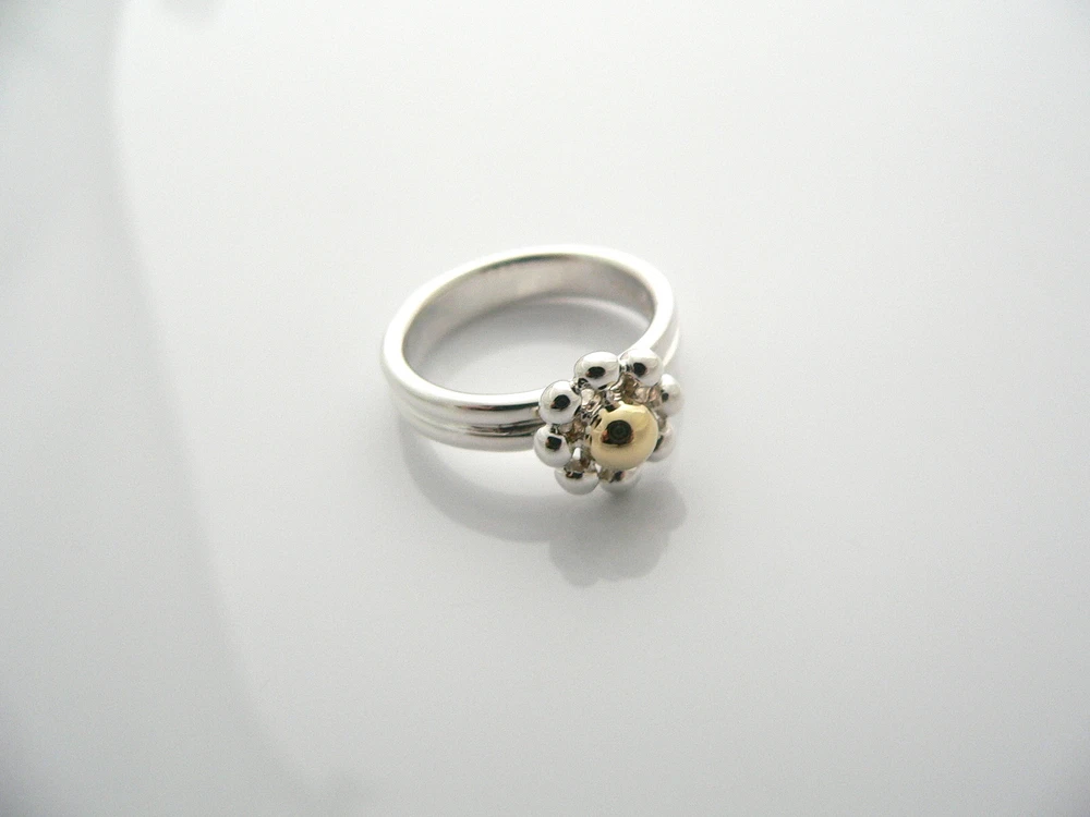 Overview: Offered for sale is a wonderful Tiffany and Co. Silver and 18K Gold Paloma Picasso Jolie Bead Flower Ring. Looks very feminine and pretty on the fingers, this ring is surely one that you will turn to over and over again. It is composed of an 18K yellow gold bead surrounded by silver beads that resemble a cute little flower. And because it is two tone, the ring will go with pretty much any other piece of jewelry you already own. It is elegant, very versatile, and extremely comfortable to wear. This wonderful piece is in very good condition. Perfect ring to start or add to your Tiffany collection. The ring is fully hallmarked and is guaranteed to be 100% authentic. Wonderful present for yourself or anyone you love! Will surely delight! Matching necklace and bangle are also available for sale in separate listings. Please have a look! Particulars: Size & Measurements: The ring is a size 6 Metal & Hallmarks: Tiffany & Co. / Paloma Picasso / 925 / 750 Solid 925 sterling silver and solid 18K gold Please check out my other unique and interesting Tiffany items on sale.