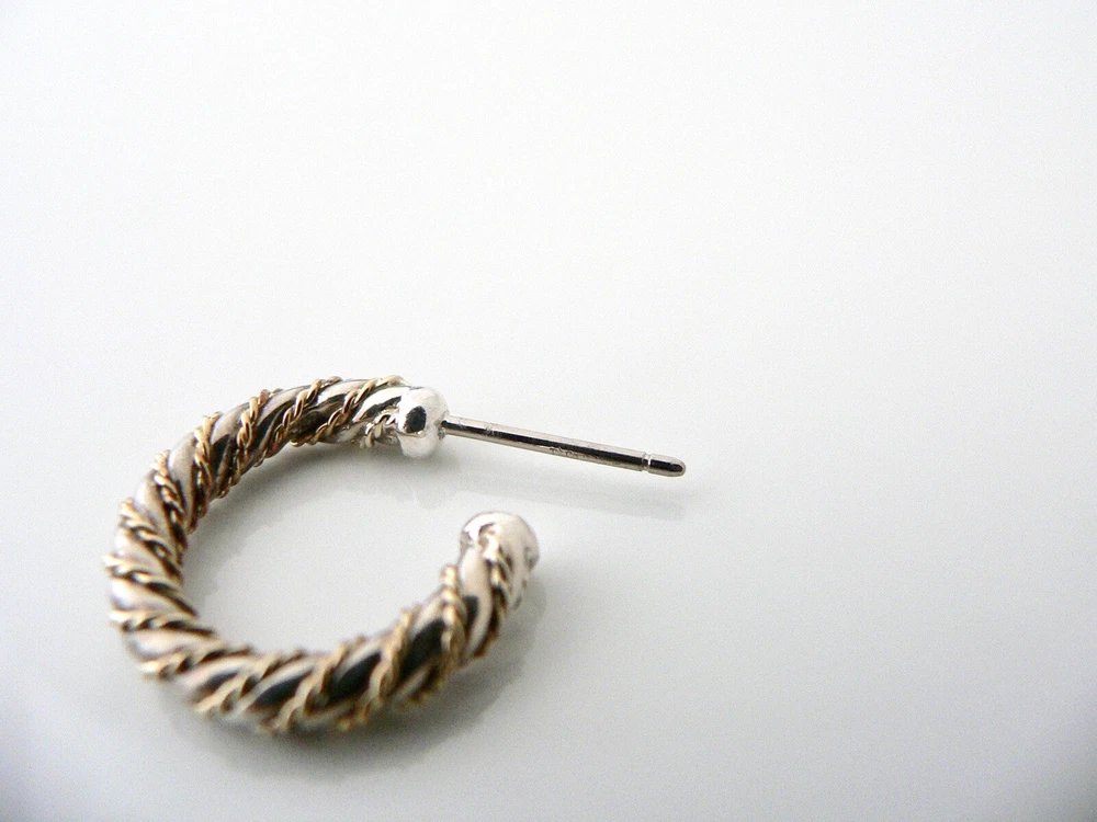 Offered for sale is a pair of Tiffany and Co. Sterling Silver 18K Gold Rope Hoop Earrings. The style is classic Tiffany, making it a piece that you will most certainly use over and over again. Great piece to wear to work, or for just going to dinner with friends in jeans or a pretty dress. Super versatile and chic piece! It's like a piece of art - right on your ears! Because the earrings are two tone, it will go well with all of your other pieces - whether it be sterling silver, white gold or yellow gold! :) Definitely a wonderful Tiffany piece to start or add to your collection. As always, the item is fully hallmarked and is guaranteed to be 100% authentic. Wonderful present for yourself or anyone you love! Will surely delight! Particulars: Size & Measurements: The earrings are approx. 0.75 inches. Metal & Hallmarks: T& Co / 925 (on earring posts) T & Co / 925 / AG (on earring backs) Solid 925 Sterling Silver and 18K Gold Please check out my other unique and interesting Tiffany items on sale.