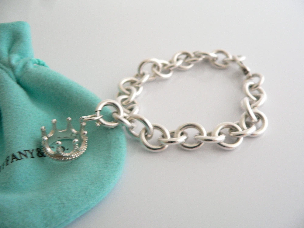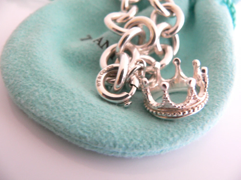 Offered for sale is a wonderful Tiffany and Co. Sterling Silver Crown Charm bracelet. The piece is made from substantial and bright Tiffany silver, and yet retains a very feminine feel to it. Attached to its very substantial Tiffany Silver charm bracelet is a fantastic and whimsical Crown charm. The charm is attached to the bracelet with a Sterling Silver Tiffany Clasp - this clasp opens and closes and thus can be used as a charm on a necklace or as part of another charm bracelet! Super versatile piece! It is a classic Tiffany piece that will most certainly be a piece that you will be used over and over again, so it is great value for the money! It is a wonderful piece that fits a lifestyle on the go -- the bracelet can be worn to almost any occasion! It is versatile, elegant, and classic all rolled into one. Imagine the piece with your professional office attire ... Now imagine it with jeans or weekend wear ... Perfect! The bracelet is in excellent condition. As always, both the charm bracelet and padlock charm are fully hallmarked and guaranteed to be 100% authentic. Wonderful present for yourself or anyone you love! Will surely delight! It will come with its Tiffany pouch as shown! Perfect and ready for gifting! Particulars: Size & Measurements: The bracelet is approx. 8.2 inches from end to end. Metal & Hallmarks: T & Co. / 925 (middle link of chain; and clasp of charm) T & Co / 925 (on Crown charm) Solid 925 sterling silver Please check out my other unique and interesting Tiffany items on sale.