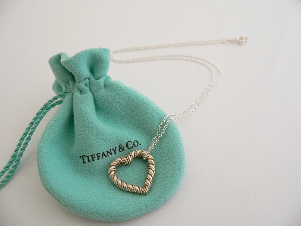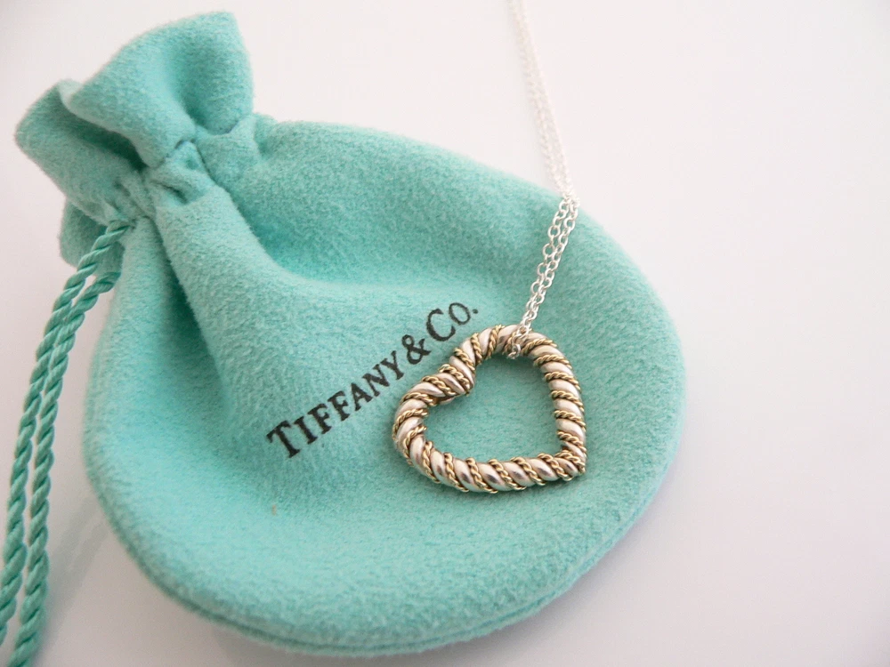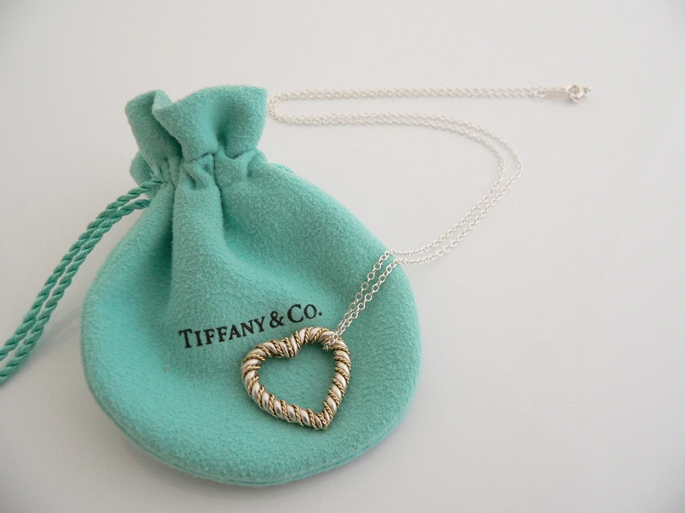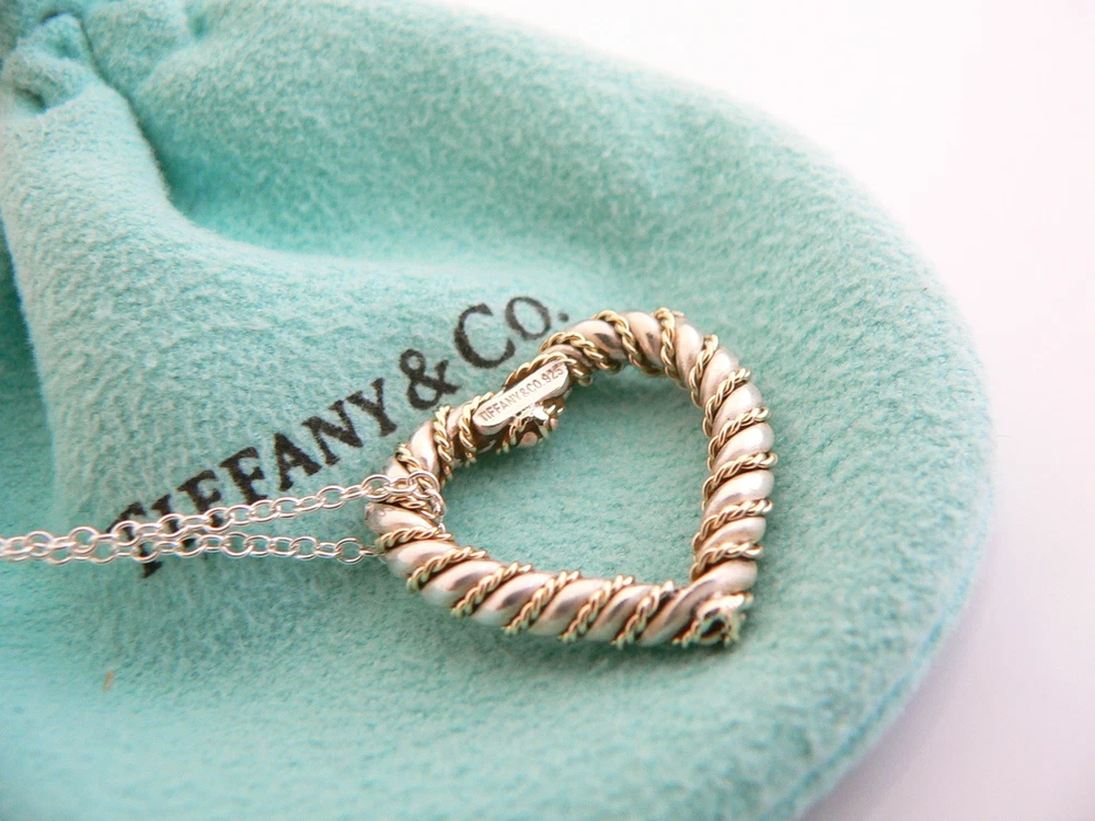 Overview: Offered for sale is a very rare, wonderful, and gorgeous Tiffany & Co. Silver & Gold Heart Twisted Rope necklace. Definitely a Tiffany piece that you will get your money's value for. It works perfectly with pretty much any attire your put on, AND is a great statement piece. Hanging from its 19.6 inch Tiffany sterling silver curb chain is a very pretty Gold / Silver Twisted Rope Heart Pendant. The Heart pendant is removable from the chain and can this be used as a charm for your other pieces as well! Wonderful and elegant way to say "I love you" without ever saying a word. Believe me ... she will know! :) And because it is two tone, the piece will complement pretty much any other piece of jewelry you already own! It is the perfect necklace that fits a lifestyle on the go -- the necklace can be worn to pretty much any occasion! It is simple, elegant, and classic all rolled into one necklace. Imagine wearing the necklace with your office attire... now imagine it with jeans or weekend wear ... Perfect anytime! The item is very comfortable to wear, and is in excellent condition. No longer in production, it is perfect for the collector. It is a perfect Tiffany piece to start or add to your collection. As always, the item is hallmarked and is guaranteed to be 100% authentic. Wonderful present for yourself or anyone you love! Will surely delight! It will come with its Tiffany pouch as shown, and is ready for gifting! Particulars: Size & Measurements: The necklace is 19.6 inches from end to end. The heart charm pendant is 0.85 inches at its widest ends. Metal & Hallmarks: Tiffany & Co. / 925 (on heart charm) Tiffany & Co / 925 (on chain clasp) Solid 925 sterling silver Please check out my other unique and interesting Tiffany items on sale.