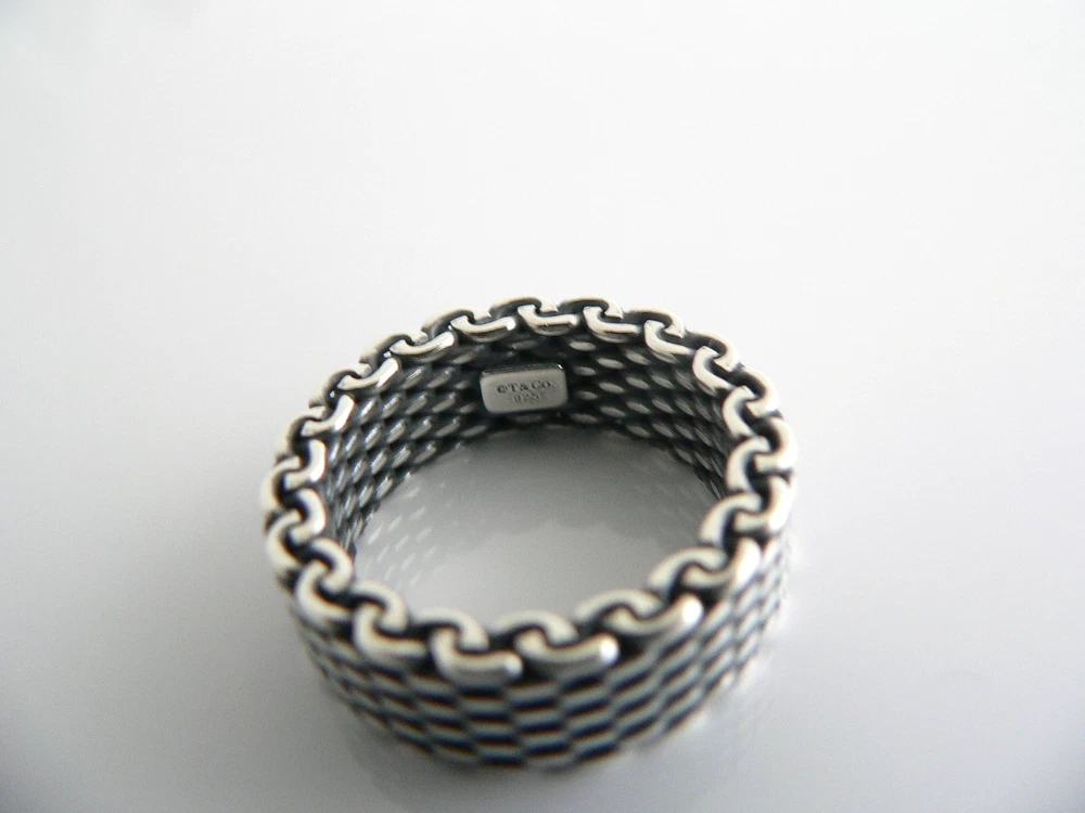 Overview: Offered for sale is a very pretty and mint Tiffany and Co. sterling silver Oxidized mesh ring. A very nice, bold piece that will certainly be a conversation starter! Adds just that touch of Tiffany style to any outfit! It is very versatile, comfortable to wear, and is in excellent / mint condition. Will work well with almost any outfit you put on - imagine the piece with a nice sundress ... now imagine wearing it with jeans and a crisp white shirt ... Perfection! Makes a great stacking ring as well! Great piece to start or add to your Tiffany collection. The ring is fully hallmarked and is guaranteed to be 100% authentic. Wonderful present for yourself or anyone you love! Will surely delight! Particulars: Size & Measurements: The ring is a size 5 Metal & Hallmarks: T & Co. / 925 Solid 925 sterling silver Please check out my other unique and interesting Tiffany items on sale.