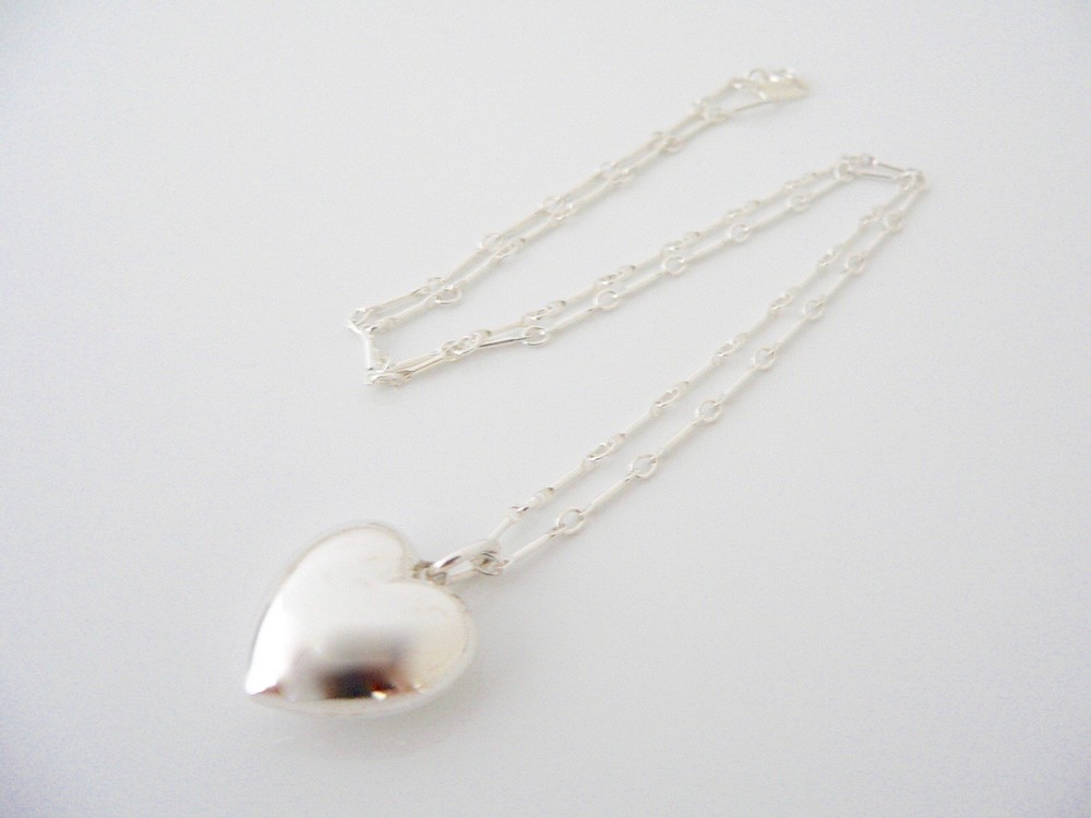 Overview: Offered for sale is a gorgeous and wonderful Tiffany and Co. Puffed Heart necklace. Guaranteed to be a conversation starter! It is just like wearing a piece of art work right on your neck - without the extremely high price! Very elegant, chic and comfortable piece! Great necklace to wear for a night in town, at a party, or just going to dinner with friends in jeans or a pretty dress. The style is classic Tiffany, making it a piece that you will most certainly use over and over again. A great Tiffany piece to start or add to your collection. No longer in production, it is perfect for the Tiffany collector. The necklace is in mint condition and does not look like it has ever been used. As always - The piece is fully hallmarked and is guaranteed to be 100% authentic. Wonderful present for yourself or anyone you love! Will surely delight! Particulars: Size & Measurements: The necklace is 18 inches from end to end. The Heart pendant is approx. 0.75 inches wide. Metal & Hallmarks: Tiffany & Co. / 925 / AG (on chain clasp) Tiffany & Co / Italy / 925 / AG (on heart charm) Solid 925 sterling silver Please check out my other unique and interesting Tiffany items on sale. Note to International buyers: Now shipping to selected countries outside the US. Please let me know if you are interested in one of my items.