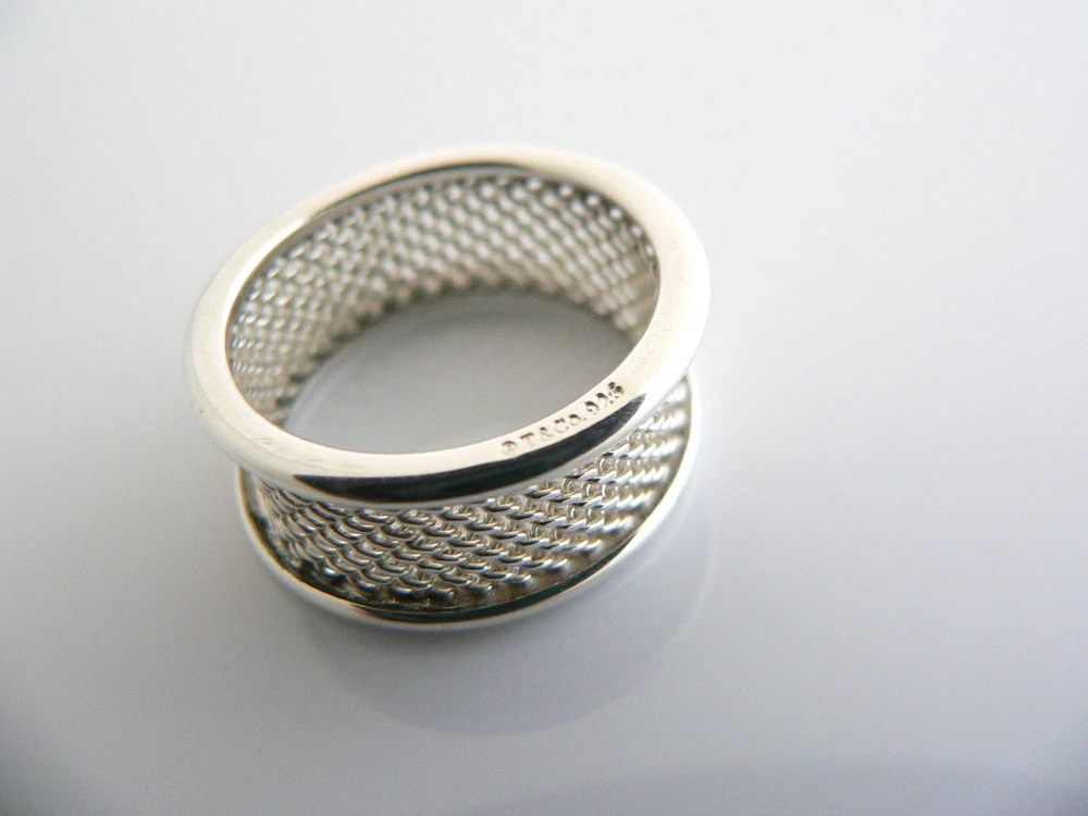 Overview: Offered for sale is a very pretty and mint Tiffany and Co. sterling silver narrow mesh ring. A very nice, bold piece that will certainly be a conversation starter! It is very versatile, comfortable to wear, and is in very good condition. Will work well with almost any outfit you put on - imagine the piece with a nice sundress ... now imagine wearing it with jeans and a crisp white shirt ... Perfection! Makes a great stacking ring as well! Great piece to start or add to your Tiffany collection. The ring is fully hallmarked and is guaranteed to be 100% authentic. Wonderful present for yourself or anyone you love! Will surely delight! Particulars: Size & Measurements: The ring is a size 5 Metal & Hallmarks: T & Co. / 925 Solid 925 sterling silver Please check out my other unique and interesting Tiffany items on sale.