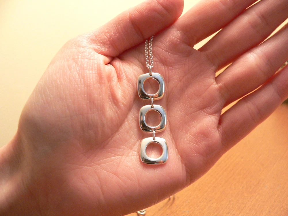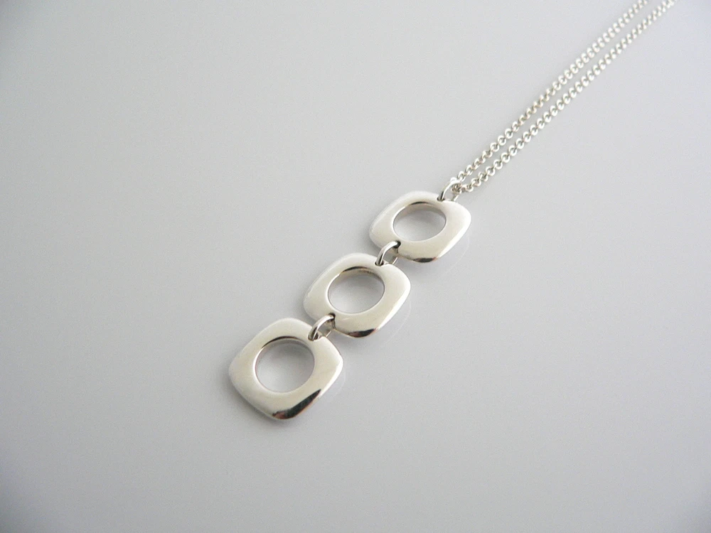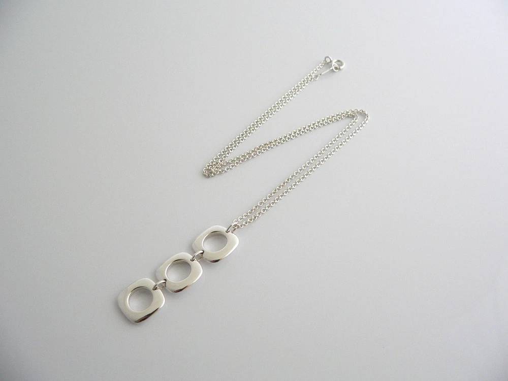 Overview: Offered for sale is a wonderful Tiffany classic. Whether you are just starting your Tiffany collection or are thinking of adding another piece, this one is perfect for you. Tiffany & Co.'s Dangling Cushion necklace is a Tiffany classic that will never go out of style. The piece makes a statement in its own subtle/simple way. It will most certainly be a piece that you will turn to over and over again, making it great value for your money. It is a wonderful necklace that fits a lifestyle on the go -- the necklace can be worn to almost any occasion! It is simple, elegant, and classic all rolled into one necklace. Imagine the piece with your professional office attire ... Now imagine it with jeans or weekend wear ... Very cool in every way! Looks just like a piece of modern art hanging from your neck - without the huge price tag of an art piece :) The item is very comfortable to wear, and is in great condition. Both pendant and chain are fully hallmarked and guaranteed to be 100% authentic. Wonderful present for yourself or anyone you love! Will surely delight! Particulars: Size & Measurements: The chain is approx. 16 inches from end to end. The pendant hangs 1.5 inches from the chain. Metal & Hallmarks: Tiffany & Co. / 925 (on pendant and chain) Solid 925 sterling silver Please check out my other unique and interesting Tiffany items on sale.