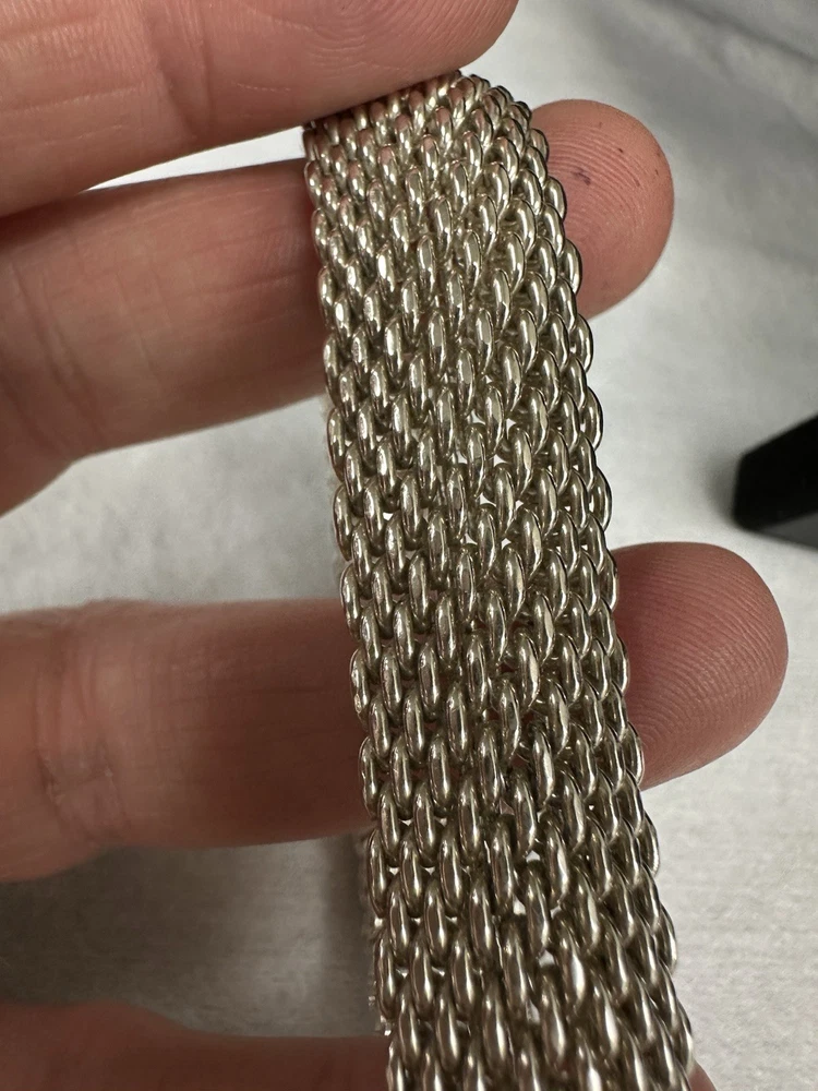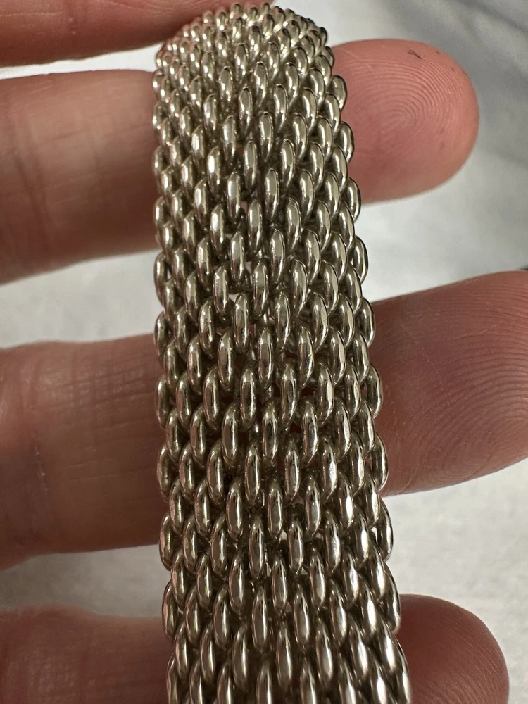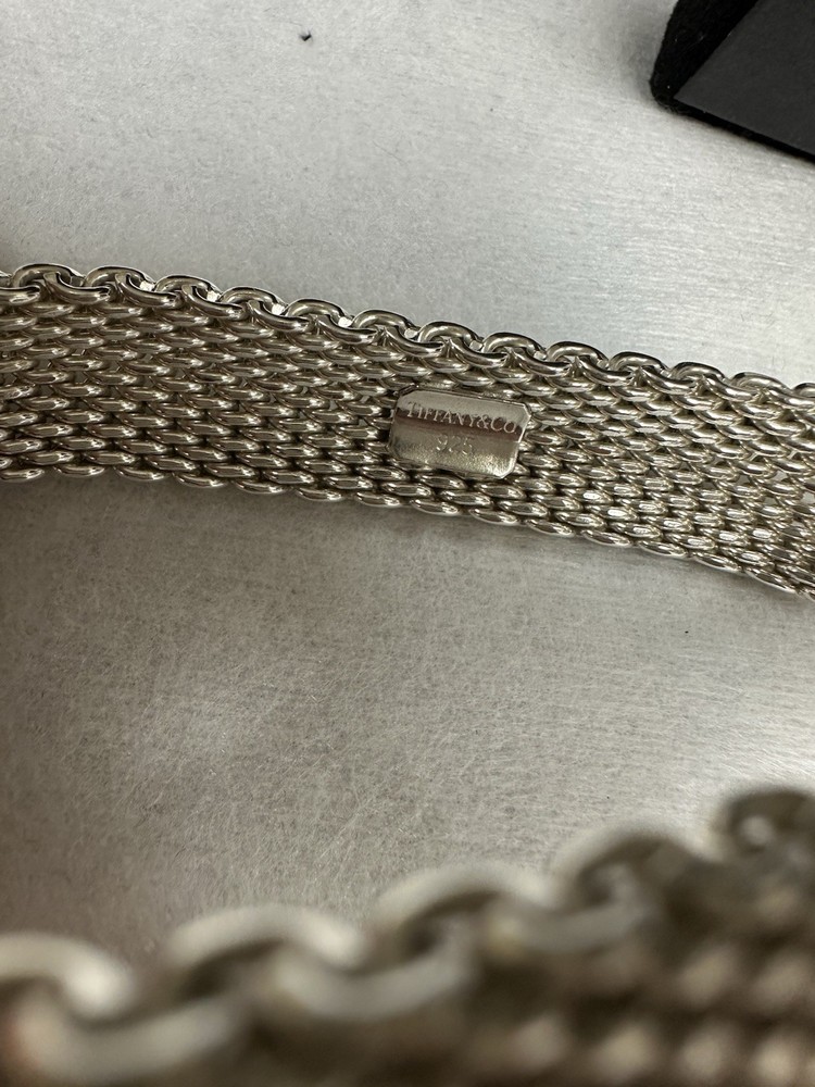 Absolutely stunning Tiffany bracelet! The Somerset mesh design is elegant and timeless, with a perfect 7.25" fit that sits beautifully on the wrist. The 15mm width gives it a delicate yet noticeable presence, and the sterling silver shines like new. No flaws at all—just pure luxury. A must-have for any jewelry lover!