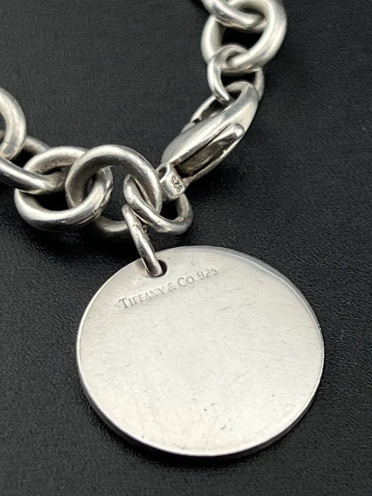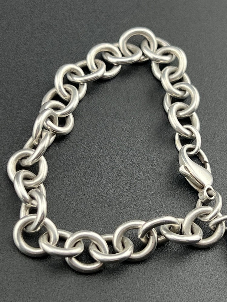 This timeless Tiffany & Co. sterling silver bracelet features a substantial round charm and classic cable link chain design. A true staple of Tiffany’s collection, this piece is perfect for everyday elegance or layered with other favorites. • Brand: Tiffany & Co. • Material: Sterling Silver (.925) • Length: Approx. 7 inches • Weight: 35 grams • Markings: “Tiffany & Co. 925” on charm and clasp • Chain Style: Cable link • Closure: Lobster clasp • Condition: Good pre-owned condition. Surface wear and light scratches consistent with age and use. Polished and ready to wear or engrave. This iconic Tiffany design is both bold and timeless. The flat tag is perfect for personalization or wearing as-is for a clean, classic look. 📦 Ships fast and securely.