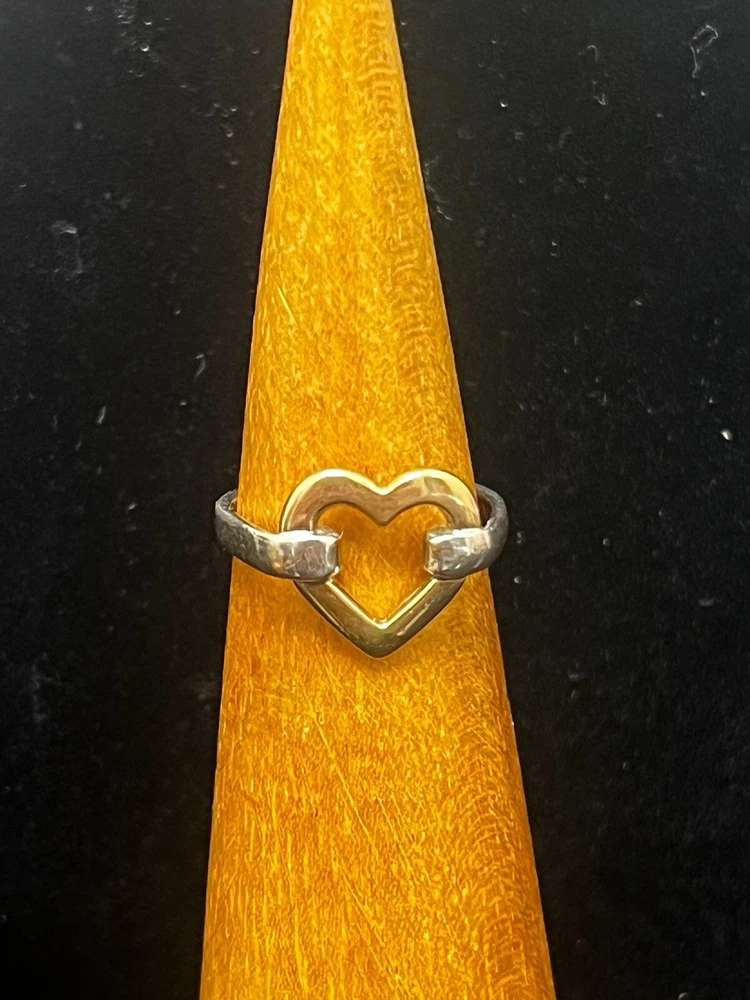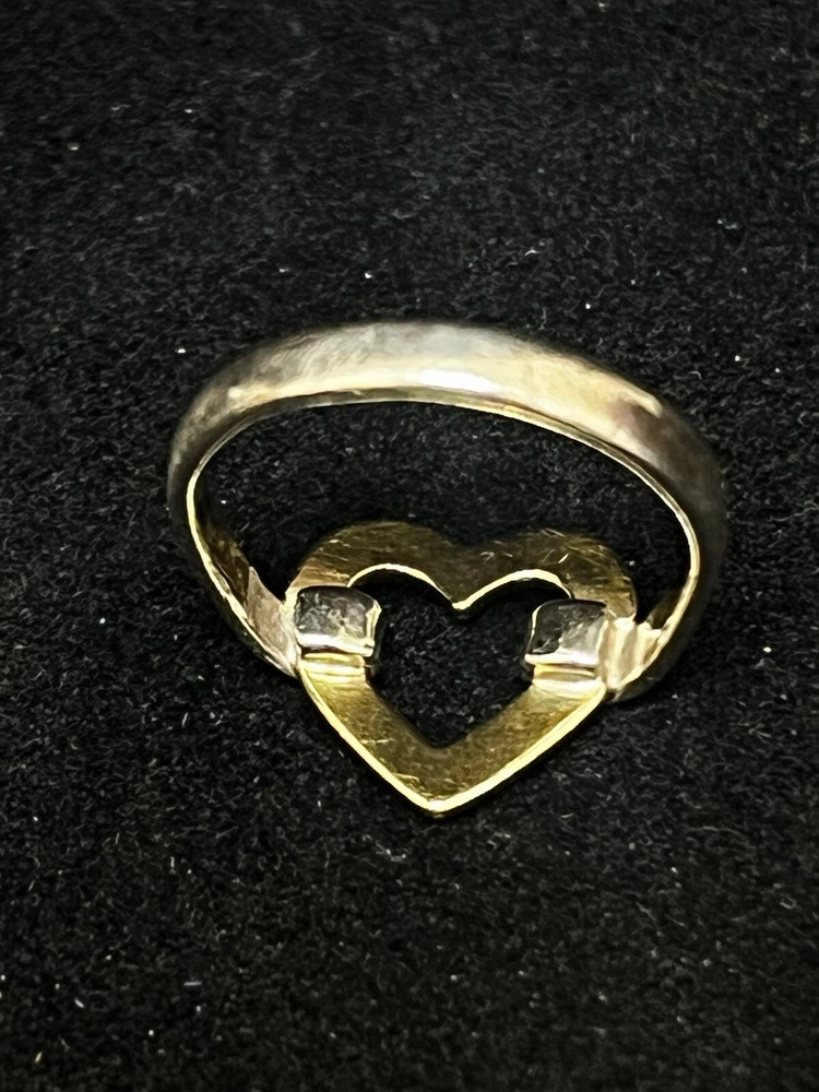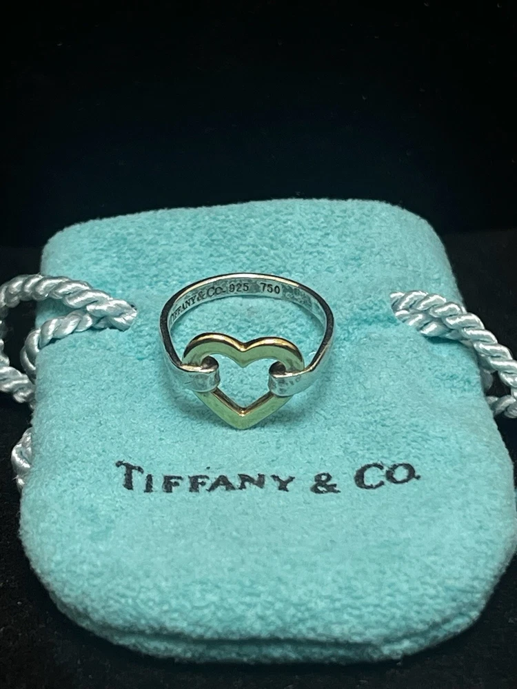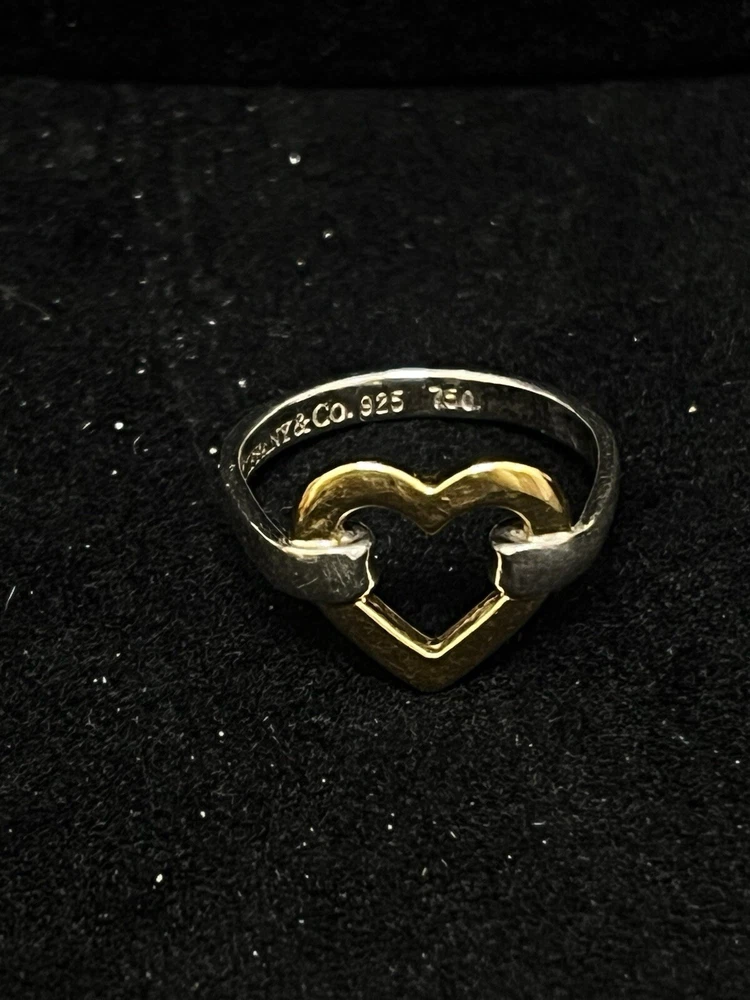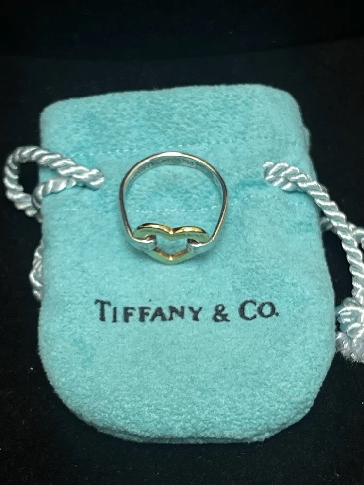 TIFFANY STERLING AND 18K YELLOW GOLD OPEN HEART RING IN VERY GOOD PREOWNED CONDITION WITH LIGHT WEAR ON THE BAND. THIS BEAUTY IS READY TO WEAR! PLEASE VIEW ALL PHOTOS.
