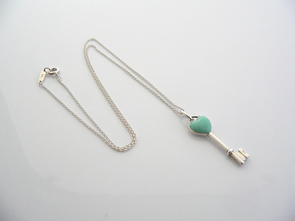 Tiffany & Co Turquoise Blue Enamel Heart Key Necklace Pendant Charm Gift Love