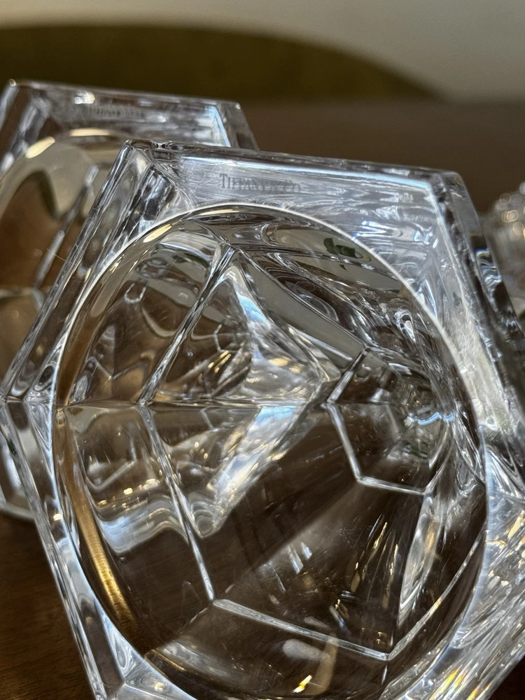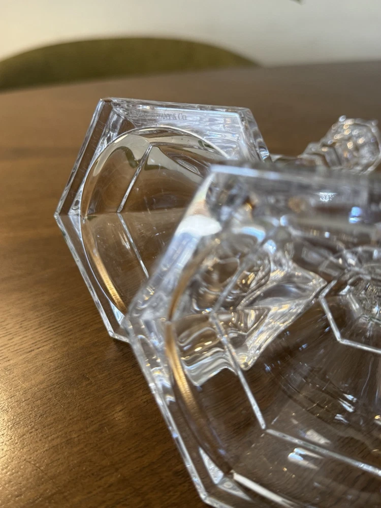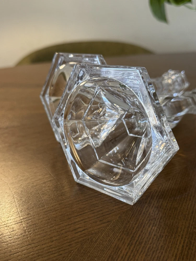 Features: Retired, signed Room: Any Room Brand: Tiffany & Co. Customized: No Number in Pack: 2 Original/Reproduction: Original Country/Region of Manufacture: Germany Item Width: approx. 4" base Finish: Smooth Item Length: approx. 9" Style: Traditional Item Height: approx. 9" Type: Candle Holder Era: Late 20th Century (1970-1999) Occasion: All Occasions Antique: No Suitable For: Furniture Department: Adults Engraved: No Material: Crystal, Glass Color: Clear
