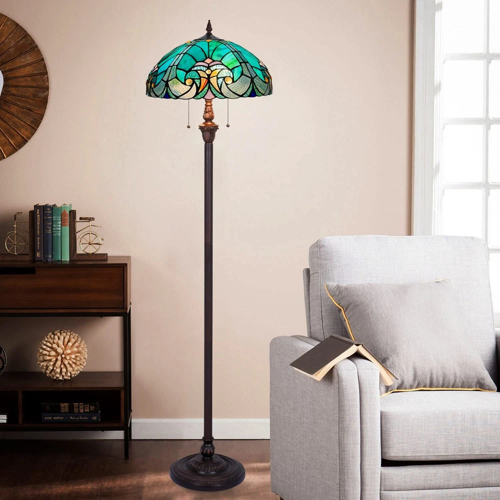 Victorian Handcrafted tiffany style floor light lampshade is slight heavy than you expected, as it is made of real stained glass. But when you knock it, it sounds like plastic. That's why? Because of its special manufacturing process. Each glass piece is cut by hand, then polish the edge before wrapping the copper foil. The edges of the glass pieces are wrapped with adhesive copper tape (copper foil). Then putted together in a mould according to the pattern. At last, using soldering material to weld each glass at a very high temperature. The Stained glass is Much Heavy than Plastic, and couldn't been burned, normal knife couldn't cut them. Easy to Check it. 【Perfect Size for Home】 Tiffany Floor Lamps in 16 inches Wide by 63 inches Tall, it comes with 70” long chain, ON/OFF pull chain switch. A stained glass floor lamp consists of a tiffany glass lamp shade and a resin construction base in blackish bronze finishing. Victorian style sea green tiffany lamp gives off a muted and relax light when lit on. It will look absolutely stunning in your room and always be a talking point for anyone visiting. 【Tiffany Floor Light Bulb Specifications】 2 Lights Large Stained glass floor lamp is featured standard E26 base bulb sockets, you can use LED, CFL or Max. 60 Watts normal Incandescent bulbs (bulbs are NOT included), different bulbs will get different looking, we recommend to use WARM LIGHT bulbs. When the lamp is switched on, the light from bulb will shine through the shade, its spectacular coloring and artistry will delight and attract the curiosity of people of all ages. 【Premium Materials】 Antique style floor lamp shade is sturdily made of 100% real stained glass. Each shade is formed from hundreds of pieces of stained glass and welded together by soldering tin at a very high temperature. Every process is totally handmade and the color is never fade. Tiffany lamps are one of the best examples of arts and crafts decor ever produced, these ornate accessories add a sense of character and history to an otherwise modern setting. 【Beautiful and Functional Piece of Decor】 The lamp shade shines the light through the glass and creates beautiful patterns. All of the colors are Vibrant and evenly toned when light on. Definitely will be the focal point of adding a touch of elegance for sitting room, bedroom and home office. A perfect fit for reading and study. 【Professional After-sale Services】 Tiffany lighting lamp is easy to install. We provide 7 x 24 hours on-line services, if you have any inquiries about lamp or installation, please feel free to contact us via Amazon. We will help you to settle all the issues.