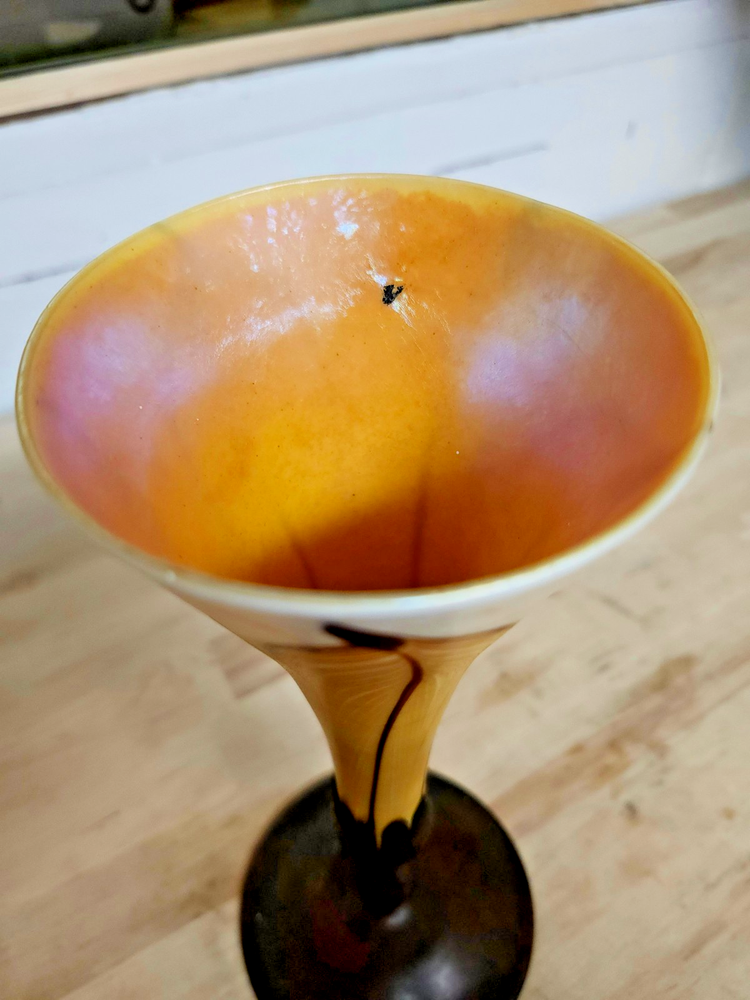 The Tiffany Studios "Pulled Feather" Favrile Glass and Bronze Vase is a vintage piece crafted by hand-blown glassmaking technique. This original studio creation from Tiffany & Co. features a unique design inspired by feathers, making it a unique and eye-catching addition to any collection. The glossy finish and handcrafted nature of the piece add to its charm and value, making it a versatile item suitable for all occasions and a must-have for collectors of studio glass art.