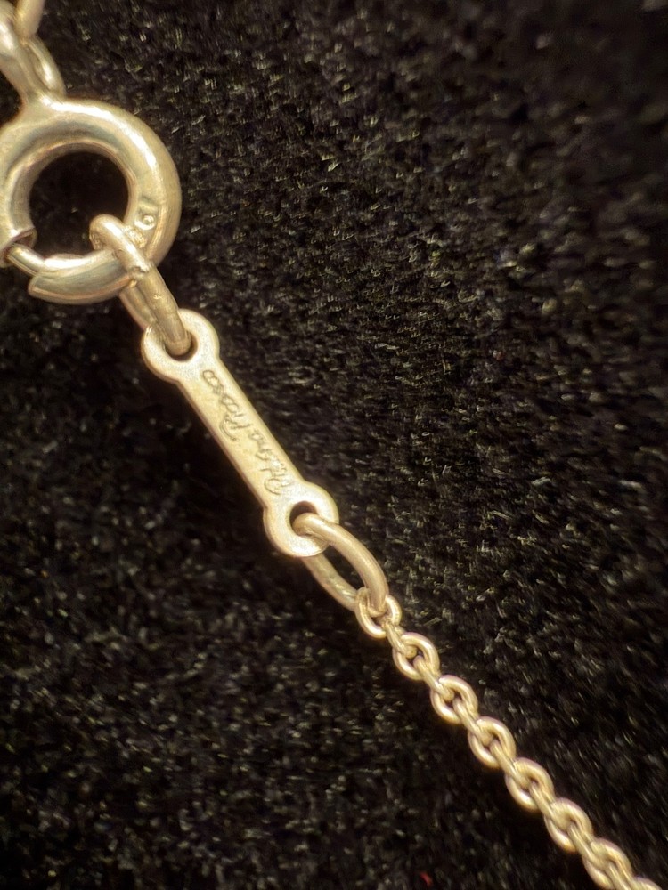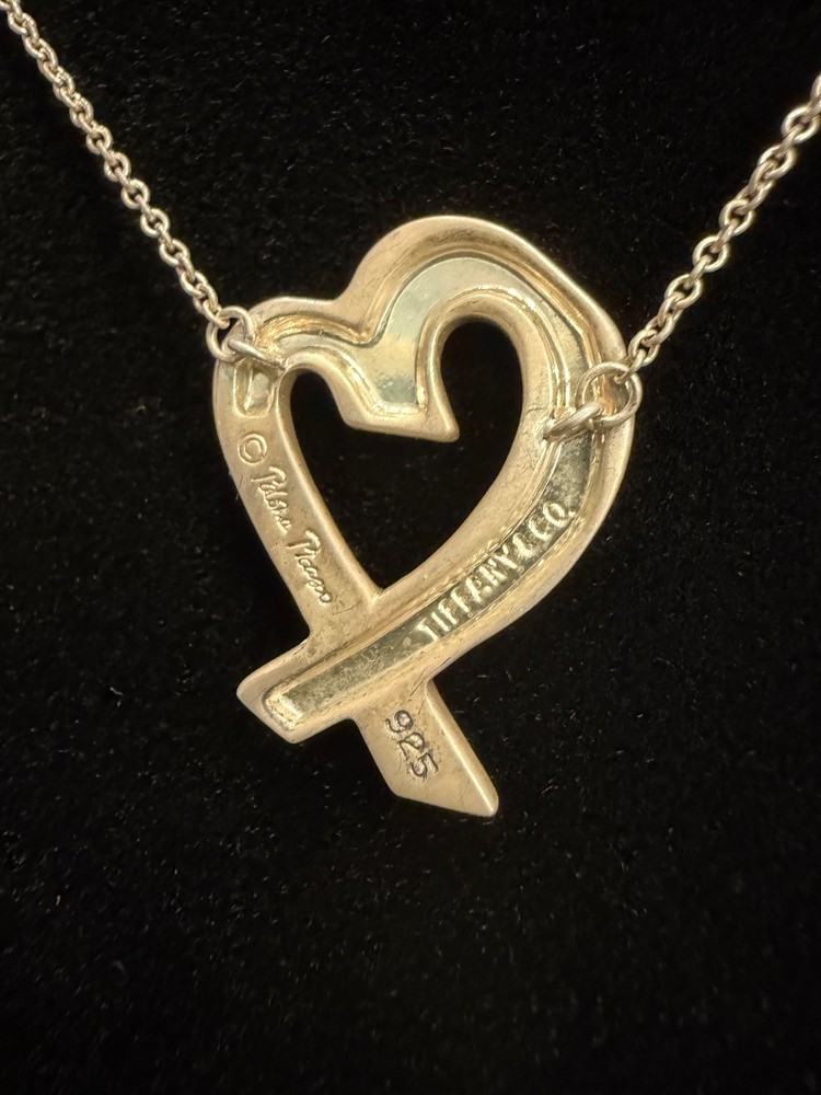 The Tiffany & Co. Paloma Picasso 'Loving Heart' Necklace in Sterling Silver is a stunning piece of fine jewelry that features a pendant with a 'Loving Heart' design by Paloma Picasso. The necklace is crafted from 925 sterling silver and has a length of 16 inches, making it a versatile and elegant accessory for any occasion. This piece is part of the Tiffany & Co. Tiffany & Love collection, perfect for those who appreciate symbolism and timeless style in their jewelry choices.