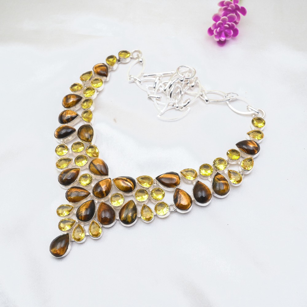 HomeTiger Eye and Citrine Gemstone Necklace Handmade in 925 Sterling Silver