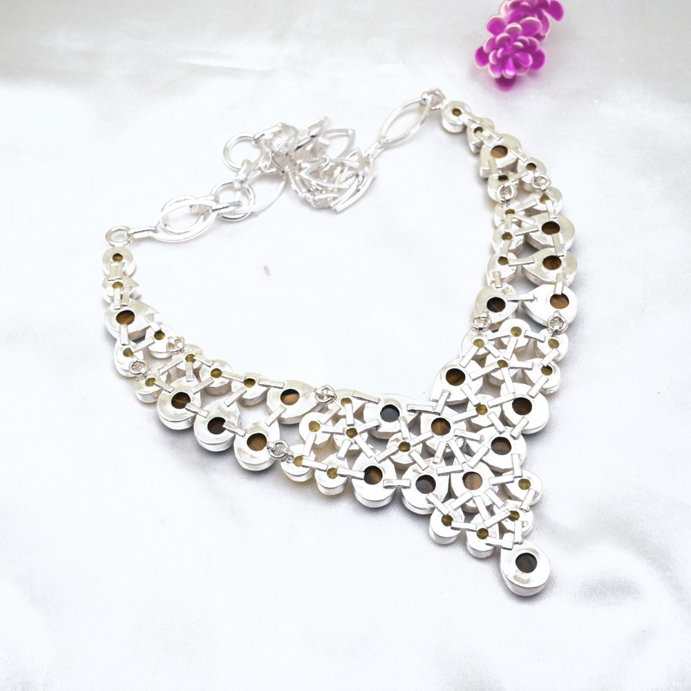 Cut Grade:Very GoodMain Stone Creation:NaturalNumber of Gemstones:51Occasion:Anniversary, Birthday, Christmas, Engagement, Father's Day, Mother's Day, Valentine's Day, WeddingMetal Purity:925Number of Diamonds:N/ACountry/Region of Manufacture:IndiaMetal:Sterling SilverNecklace Length:18 Inches With Adjustable ChainMain Stone Color:YellowStyle:NecklaceMaterial:Stone, GemstoneCertification:N/AMain Stone:CitrineCollection:HandmadeColor:SilverMain Stone Shape:PearType:NecklaceTheme:Beauty, Bohemian, Ethnic, Halloween, LoveBrand:HandamdeMain Stone Treatment:Not EnhancedPendant/Locket Type:CharmFeatures:HandmadeTotal Carat Weight:10 carat and aboveBase Metal:Sterling SilverColored Diamond Intensity:N/AClosure:Same As PictureSetting Style:BezelPendant Shape:Same As PictureCountry of Origin:IndiaDiamond Color Grade:N/AChain Type:Same As PictureDiamond Clarity Grade:N/ASecondary Stone:Citrine, Tiger's Eye