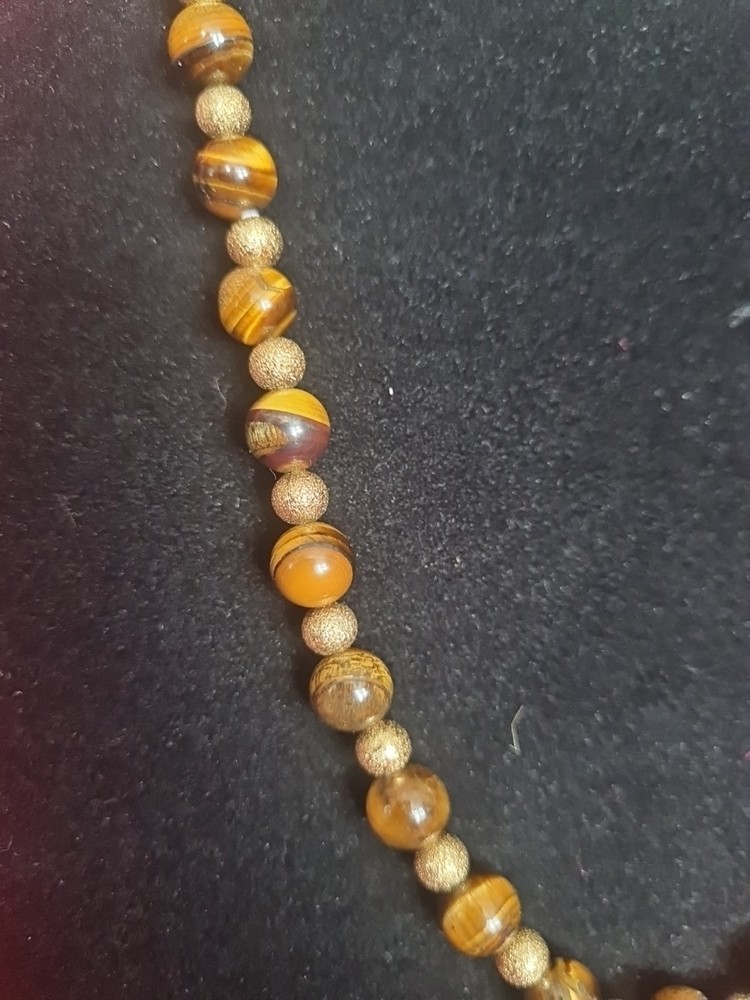 A handmade tigers eye and gold coloured bead necklace measuring 17 inches. There are 31 tigers eye beads interspersed with gold coloured textured beads which really set off the tigers eye.