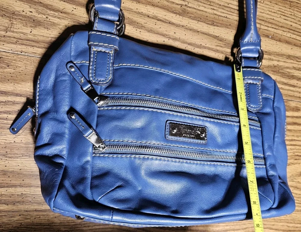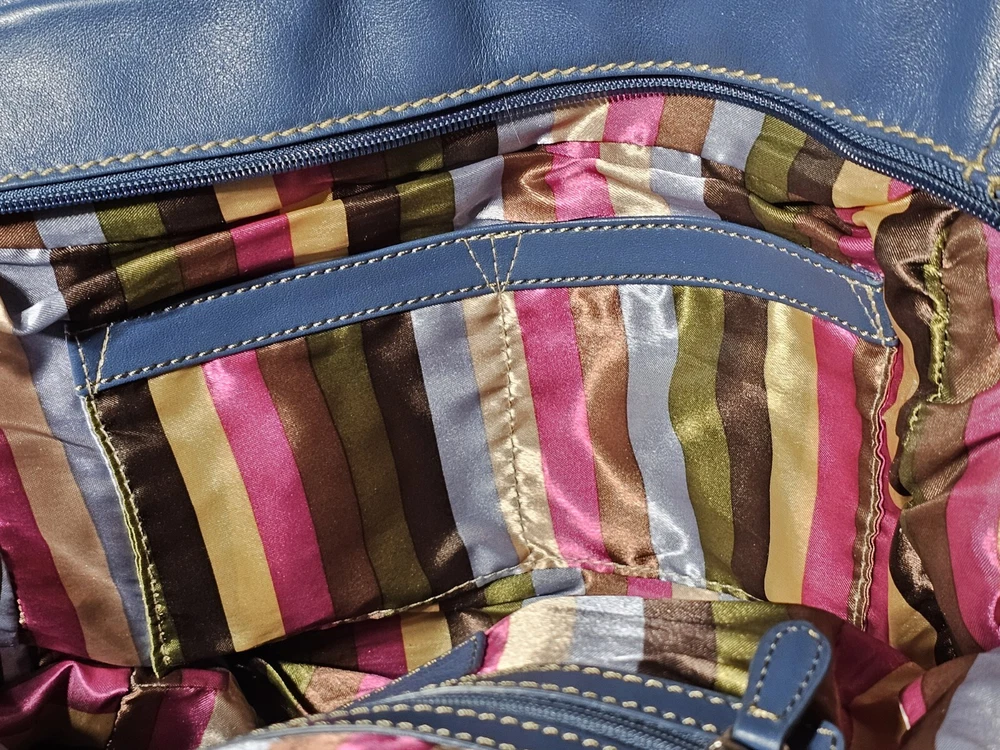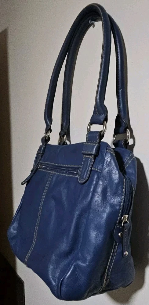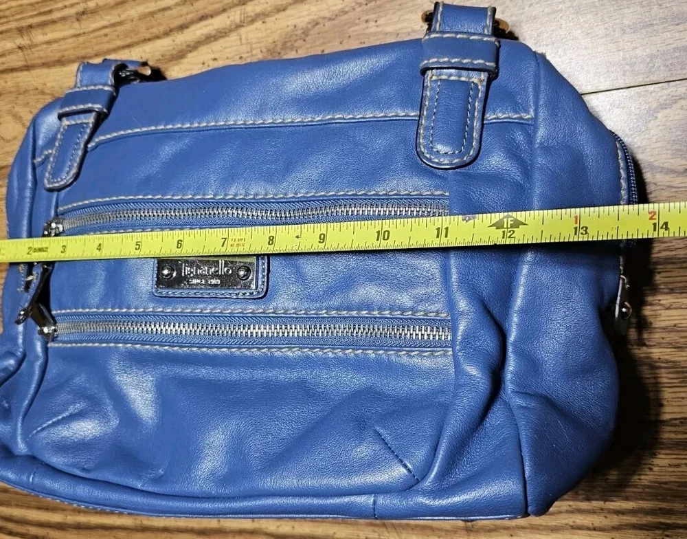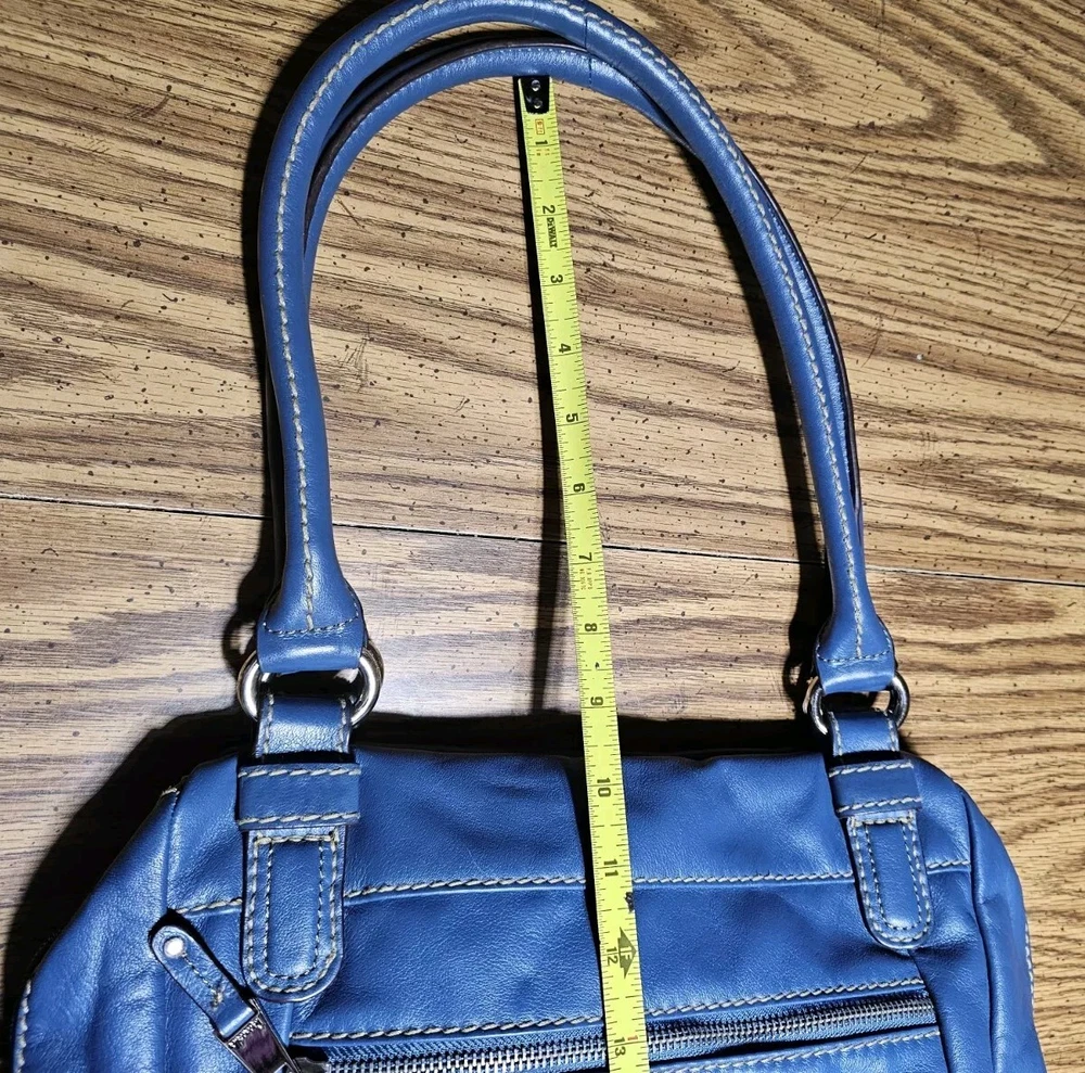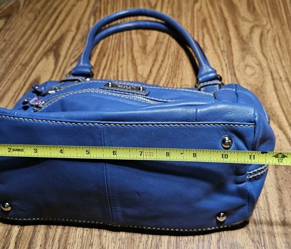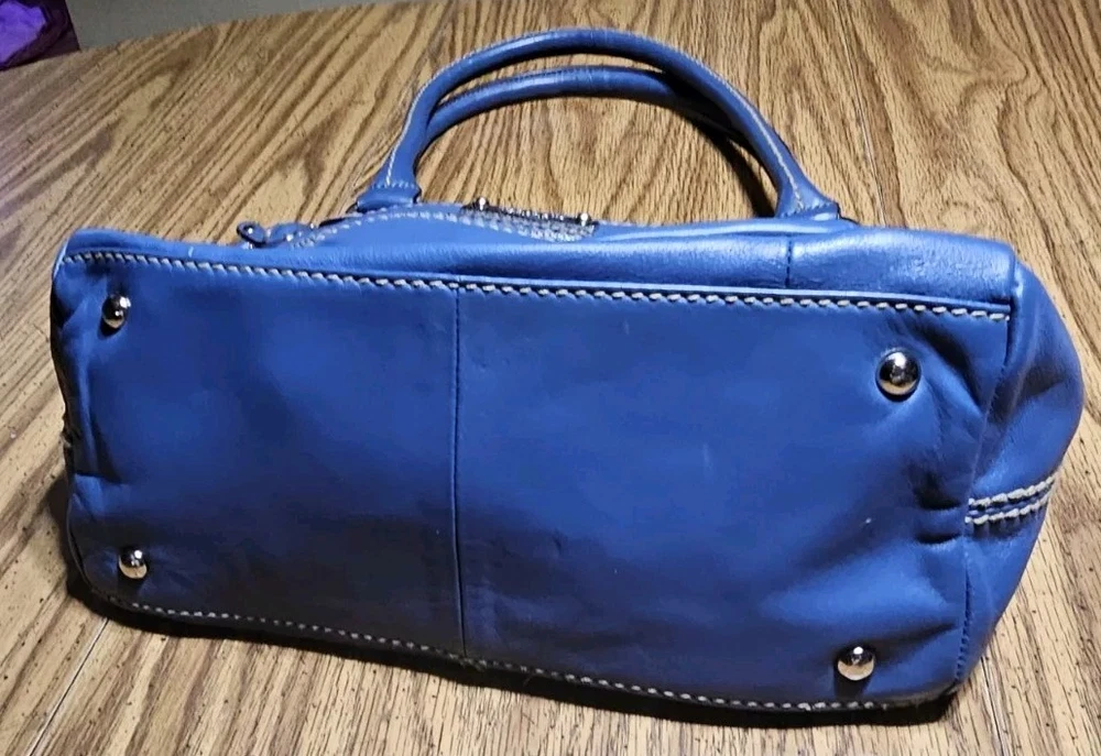 This Tignanello shoulder purse is crafted from blue leather with a pebbled finish, featuring a vibrant and colorful lining in brown. The medium-sized bag has a solid pattern with a playful character of pebbles, making it a stylish Y2K-inspired accessory for women. It is designed with a magnetic snap closure, silver hardware accents, and a comfortable leather handle in blue, making it a chic and practical choice for everyday use. If you have any questions, please feel free to contact me on eBay messenger! Very motivated seller and will accept any respectable counter offer sent in my direction! Thank you so much for reading this post from Foxy Stang Upcycler Store! 🦊Have A Wonderful Foxy Stang Day!!!!🦊