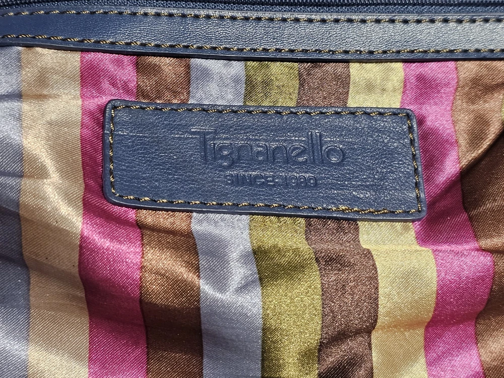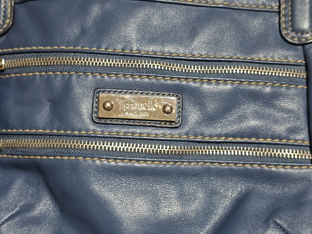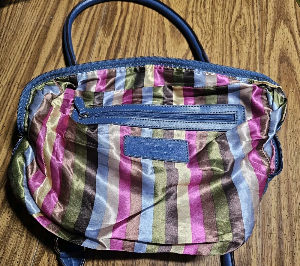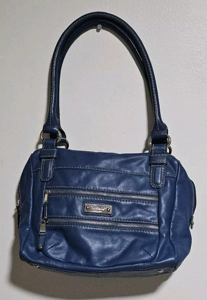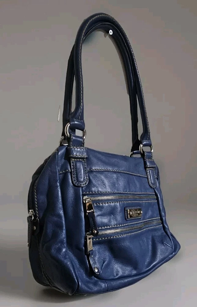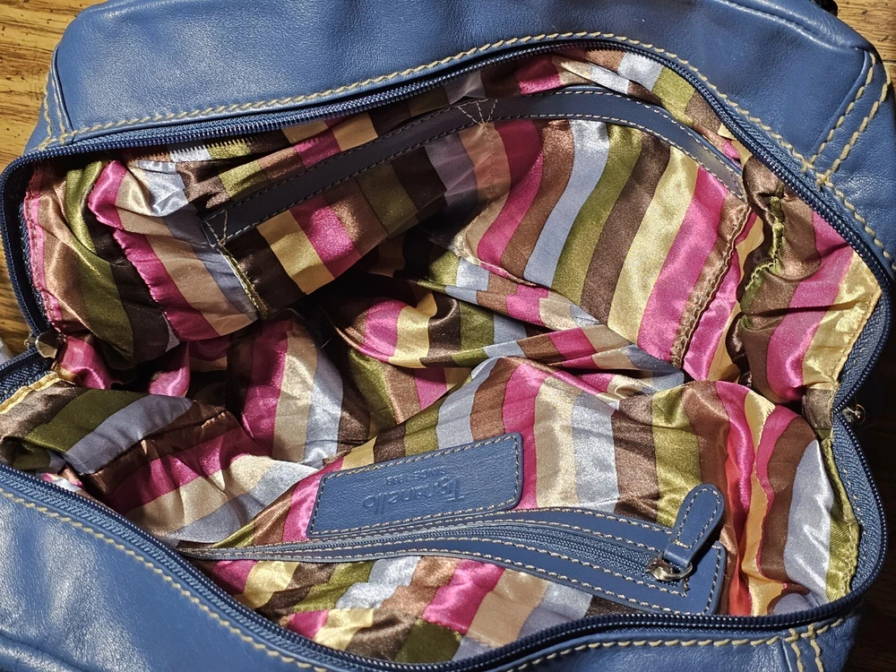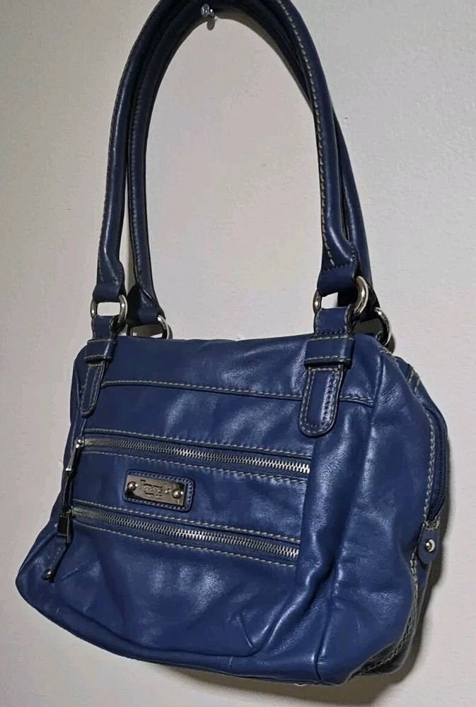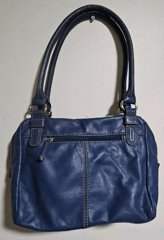 This Tignanello shoulder purse is crafted from blue leather with a pebbled finish, featuring a vibrant and colorful lining in brown. The medium-sized bag has a solid pattern with a playful character of pebbles, making it a stylish Y2K-inspired accessory for women. It is designed with a magnetic snap closure, silver hardware accents, and a comfortable leather handle in blue, making it a chic and practical choice for everyday use. If you have any questions, please feel free to contact me on eBay messenger! Very motivated seller and will accept any respectable counter offer sent in my direction! Thank you so much for reading this post from Foxy Stang Upcycler Store! 🦊Have A Wonderful Foxy Stang Day!!!!🦊
