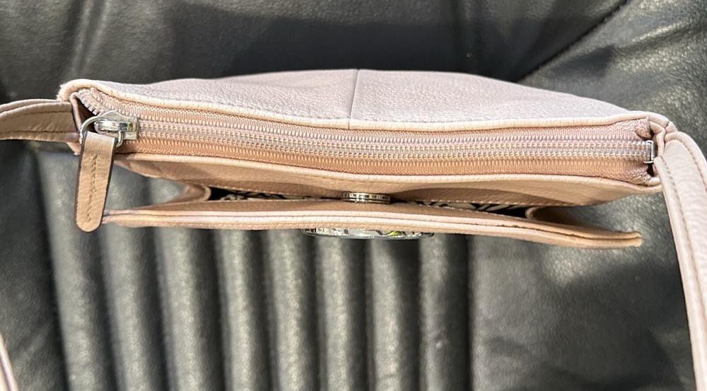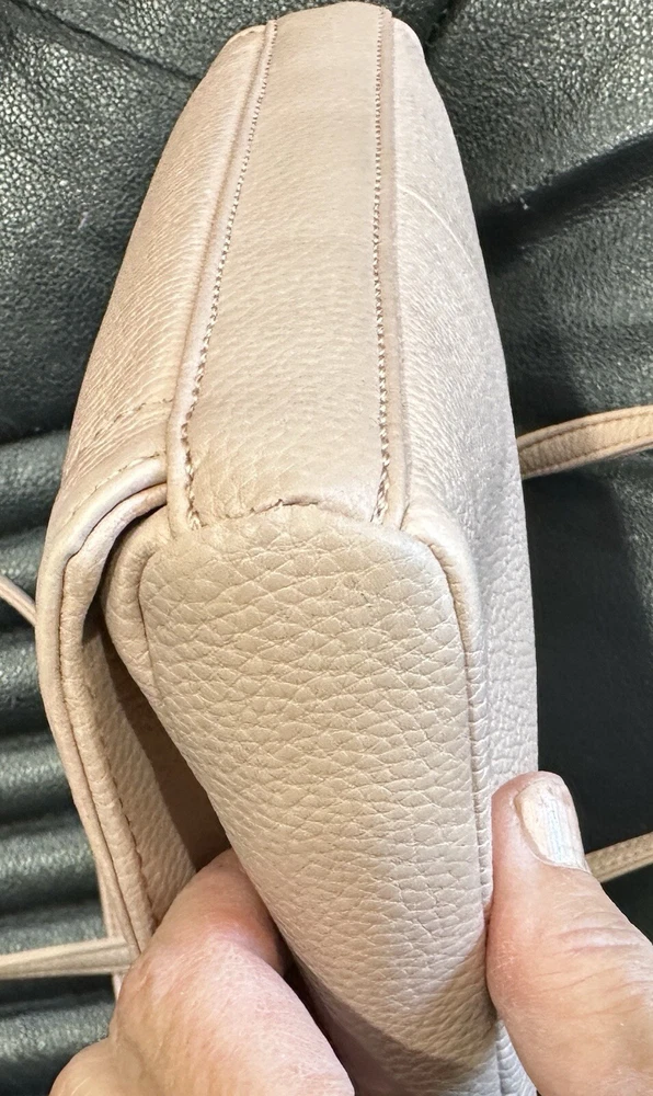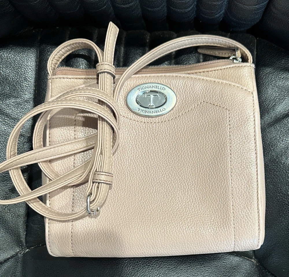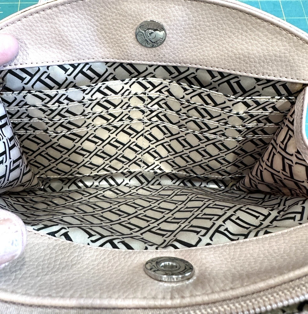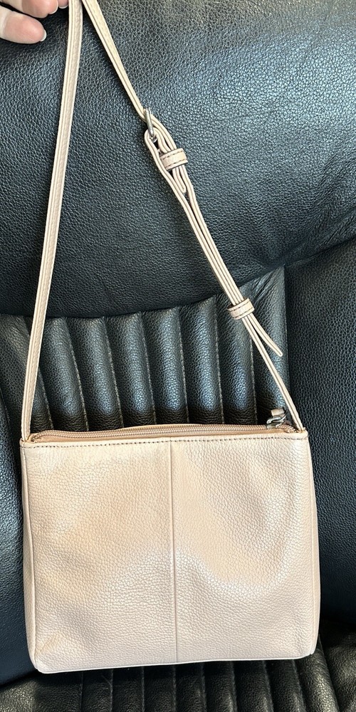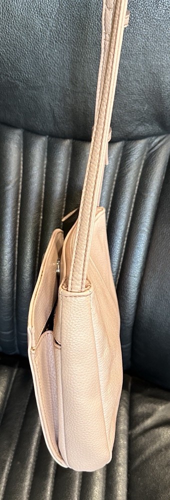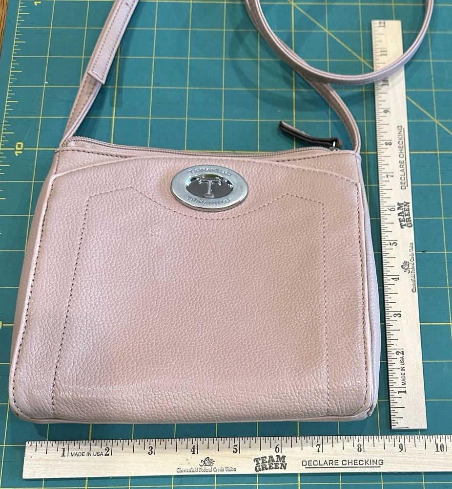 Tignanello VTG Ice Pink Pebble Leather Toggle Slim Organizer Crossbody Bag measures approx. 8.25" x 7.25" x 1.5-2" Strap drop adjustable from 23" to 25" Front flap opens via toggle..Inside is room for your phone/ wallet, and 8 credit cards Inside zipped section, is a zip pocket, and 2 slip pockets Bag has been thoroughly cleaned, ready to go.., very little evidence of corner wear, etc. Great condition..no holes, tears, nor ink, very little evidence of corner wear, etc.
