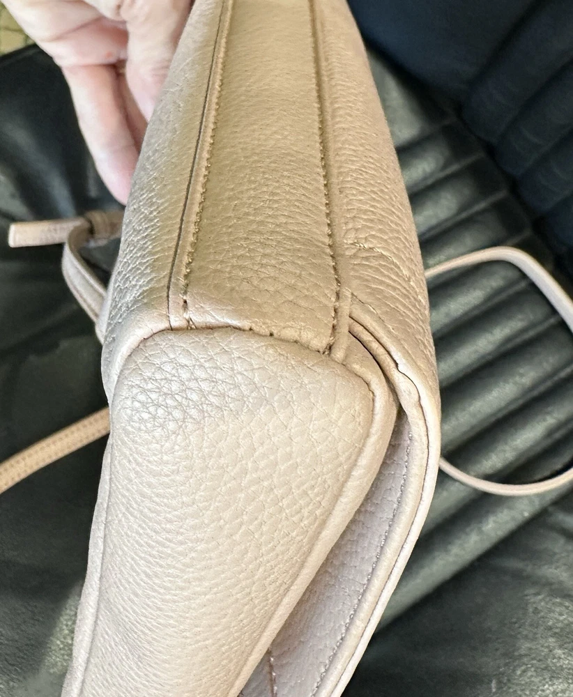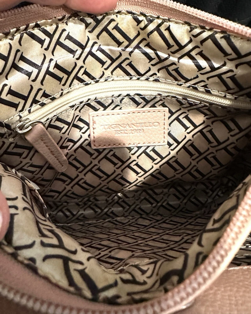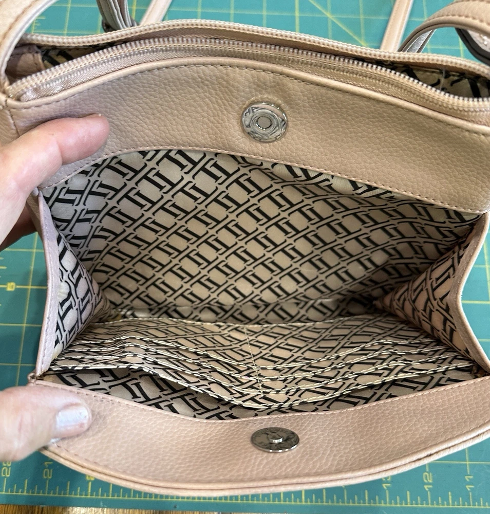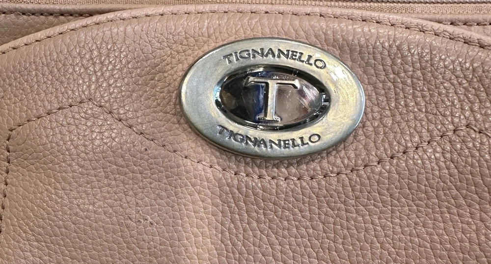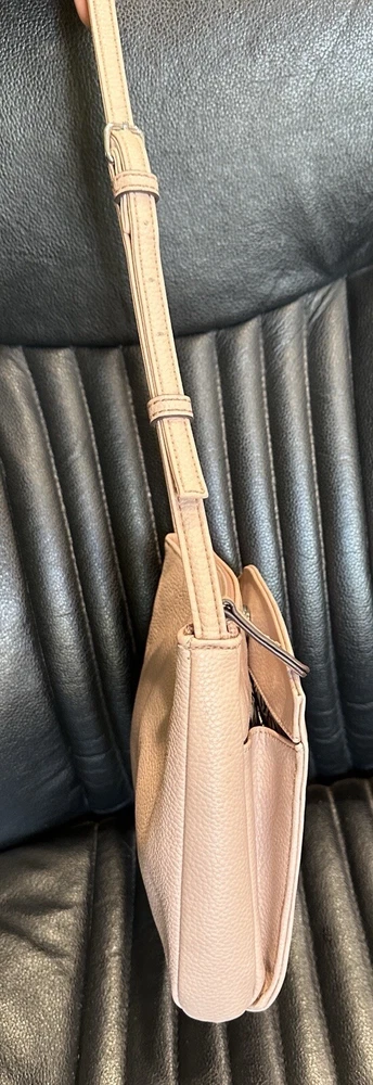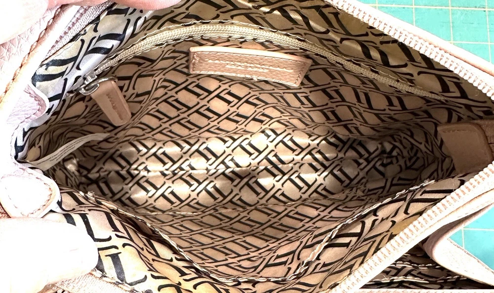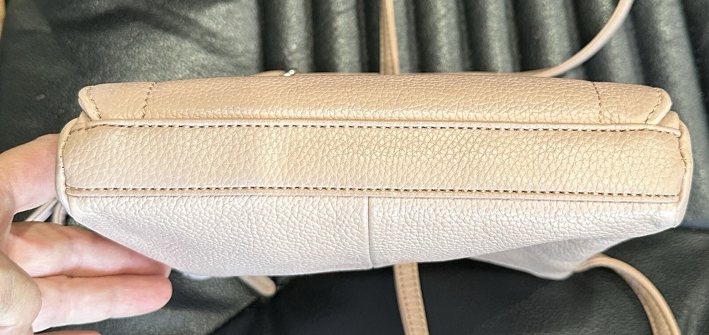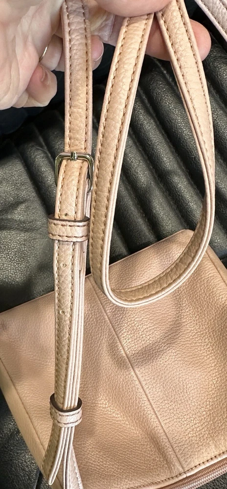 Tignanello VTG Ice Pink Pebble Leather Toggle Slim Organizer Crossbody Bag measures approx. 8.25" x 7.25" x 1.5-2" Strap drop adjustable from 23" to 25" Front flap opens via toggle..Inside is room for your phone/ wallet, and 8 credit cards Inside zipped section, is a zip pocket, and 2 slip pockets Bag has been thoroughly cleaned, ready to go.., very little evidence of corner wear, etc. Great condition..no holes, tears, nor ink, very little evidence of corner wear, etc.