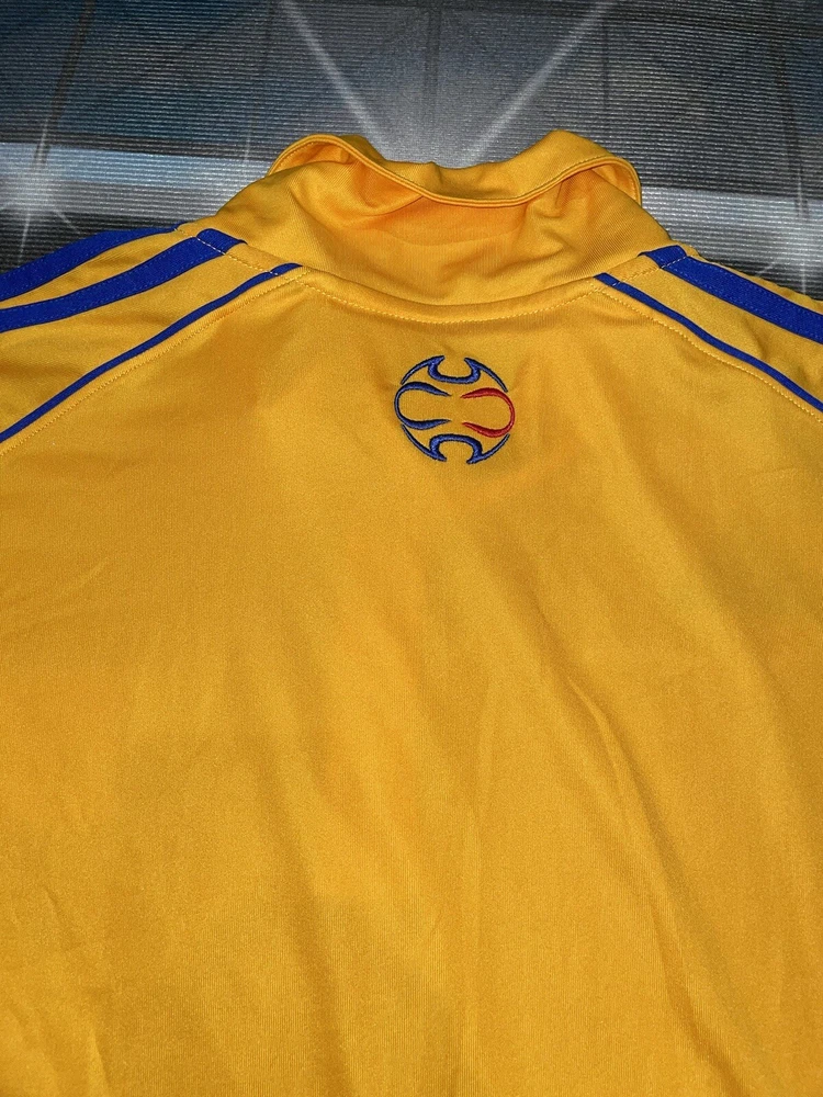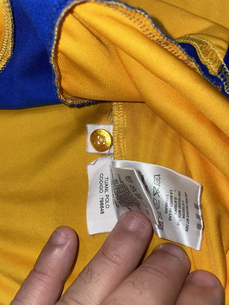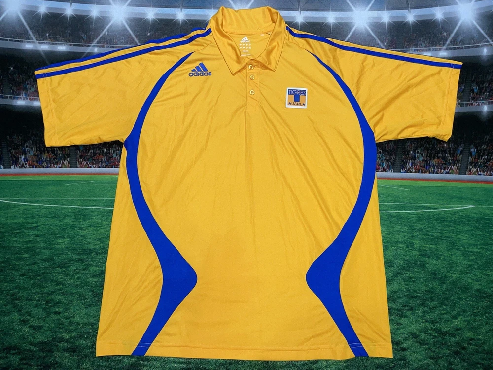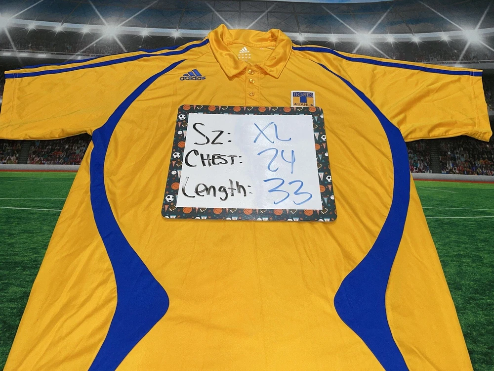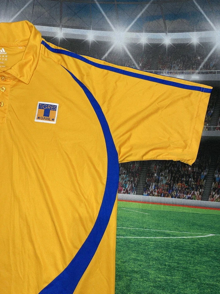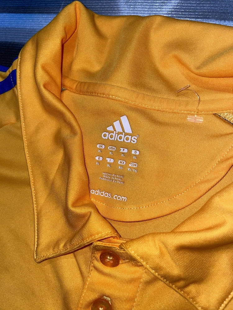 Show your support for Tigres UANL with this preowned Adidas polo shirt in size XL. The vibrant yellow color is sure to make you stand out in the crowd while cheering on your favorite soccer team. This shirt is perfect for any fan looking to add to their collection of sports memorabilia. The shirt is in great condition and has been well-maintained, ensuring that it will last for years to come. Whether you're at the stadium or watching the game from home, this polo shirt is a must-have for any Tigres UANL fan.