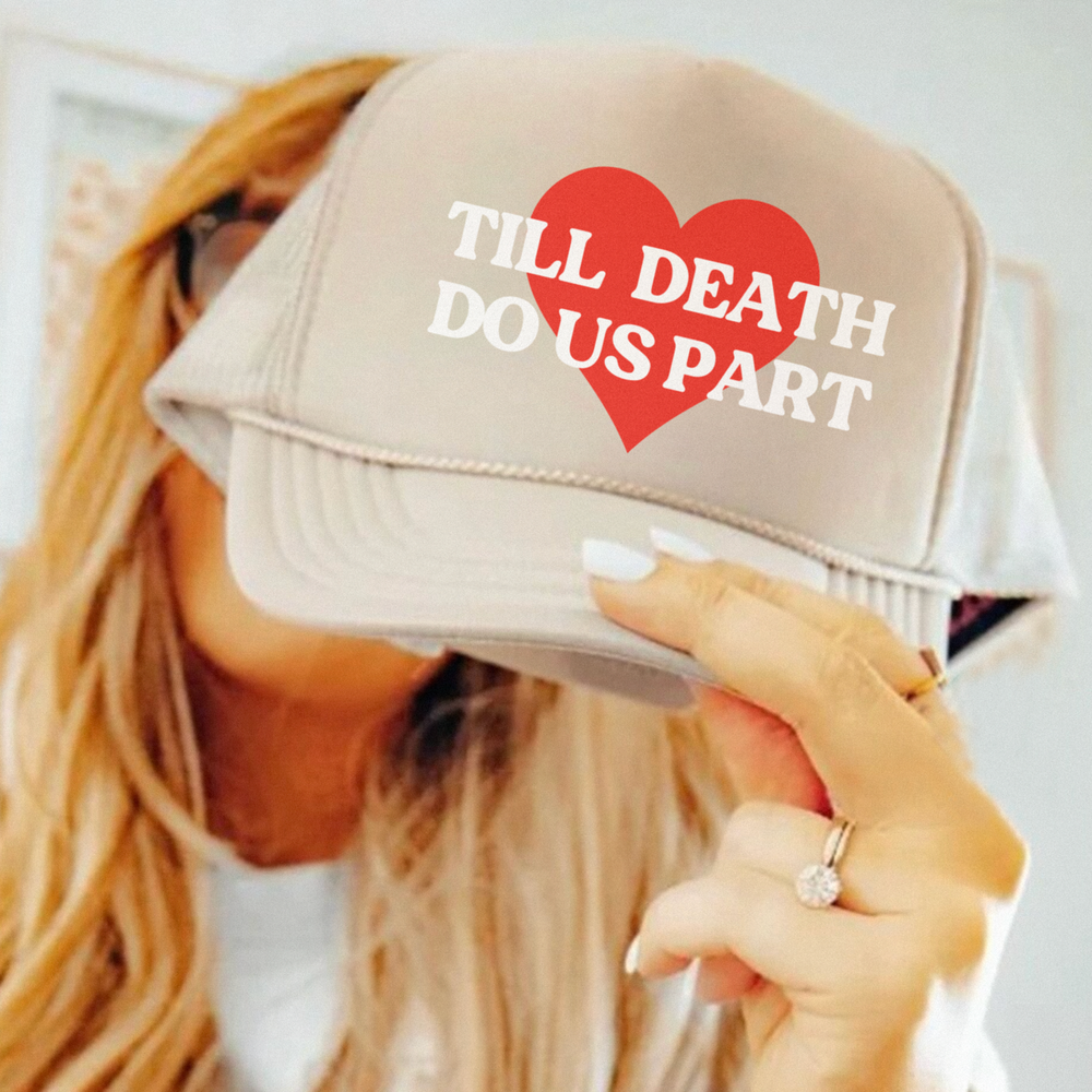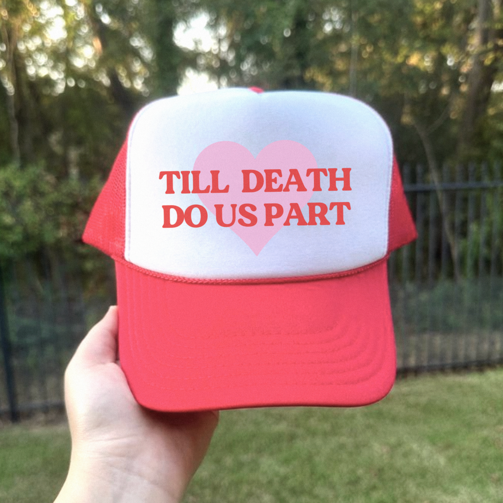💍 Till Death Do Us Part 💕 Celebrate love and commitment with this charming "Till Death Do Us Part" trucker hat—perfect for newlyweds, brides-to-be, or anyone celebrating their journey to “forever.” Featuring a heart behind the text and customizable font and heart colors, this hat adds a stylish and sentimental touch to any outfit. ✨ Hat Features: * Material: Made from 100% durable polyester for long-lasting wear. * Design: Structured with a firm front panel and seamless foam front panel with lining for a polished look. * Visor: Slightly curved with 6 rows of stitching and a matching fabric undervisor. * Comfort: Matching color sweatband ensures comfort for all-day wear. * Fit: Adjustable plastic snap closure for the perfect fit. * Size: One size fits most adults, measuring 22.8 inches (58 cm) in circumference. ✨ Customization Options: Choose any font and heart color to make it uniquely yours or match your wedding theme! 📦 Processing Time: Hats take 1–7 days to make and ship. Be sure to plan ahead for your special day! 🎉 Why You’ll Love It: * Perfect for bridal showers, honeymoon adventures, or casual wedding festivities. * A thoughtful and stylish gift for newlyweds or engaged couples. * Lightweight, durable, and oh-so-cute! Order yours today and wear your love proudly! Tags: till death do us part hat, newlywed trucker hat, bride-to-be hat, wedding gift hat, custom bridal hat, honeymoon accessories, cute wedding hat, customizable trucker hat, heart-themed hat, engaged couple hat, bridal shower gift, funny wedding hat, romantic trucker hat, personalized wedding hat