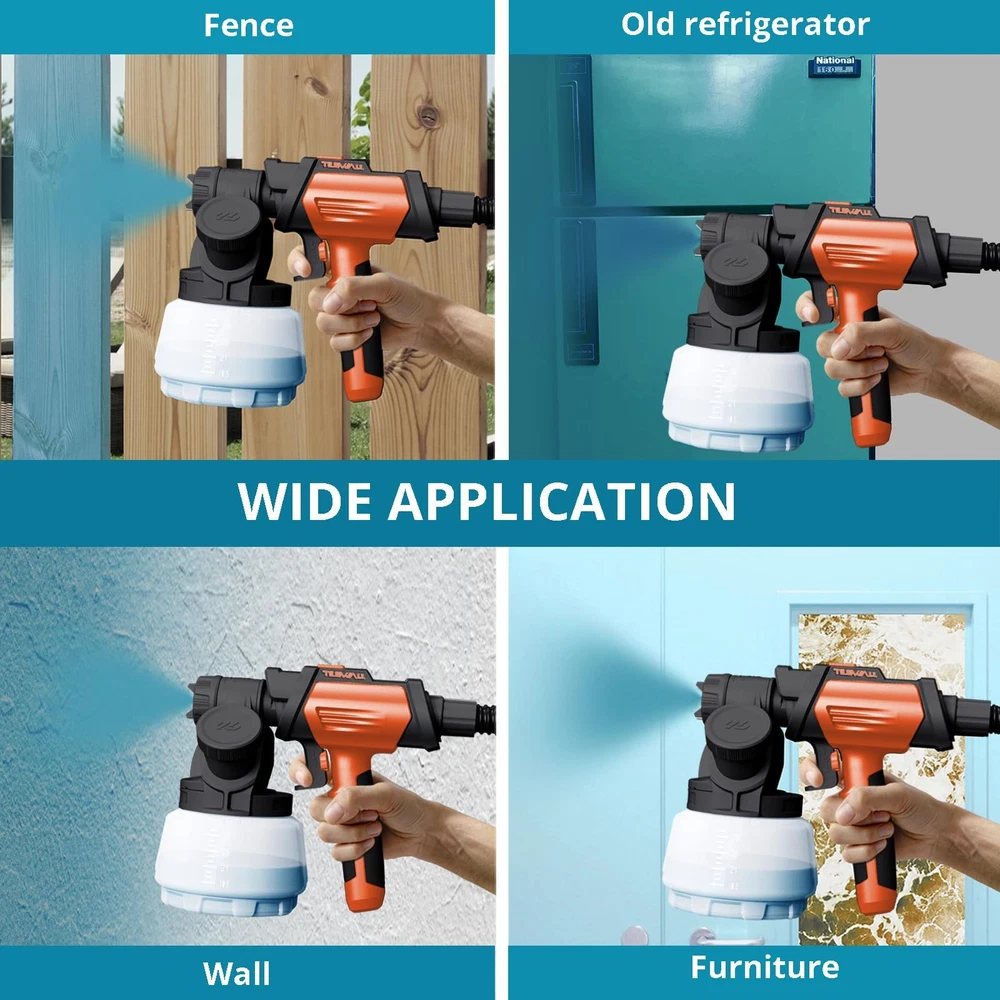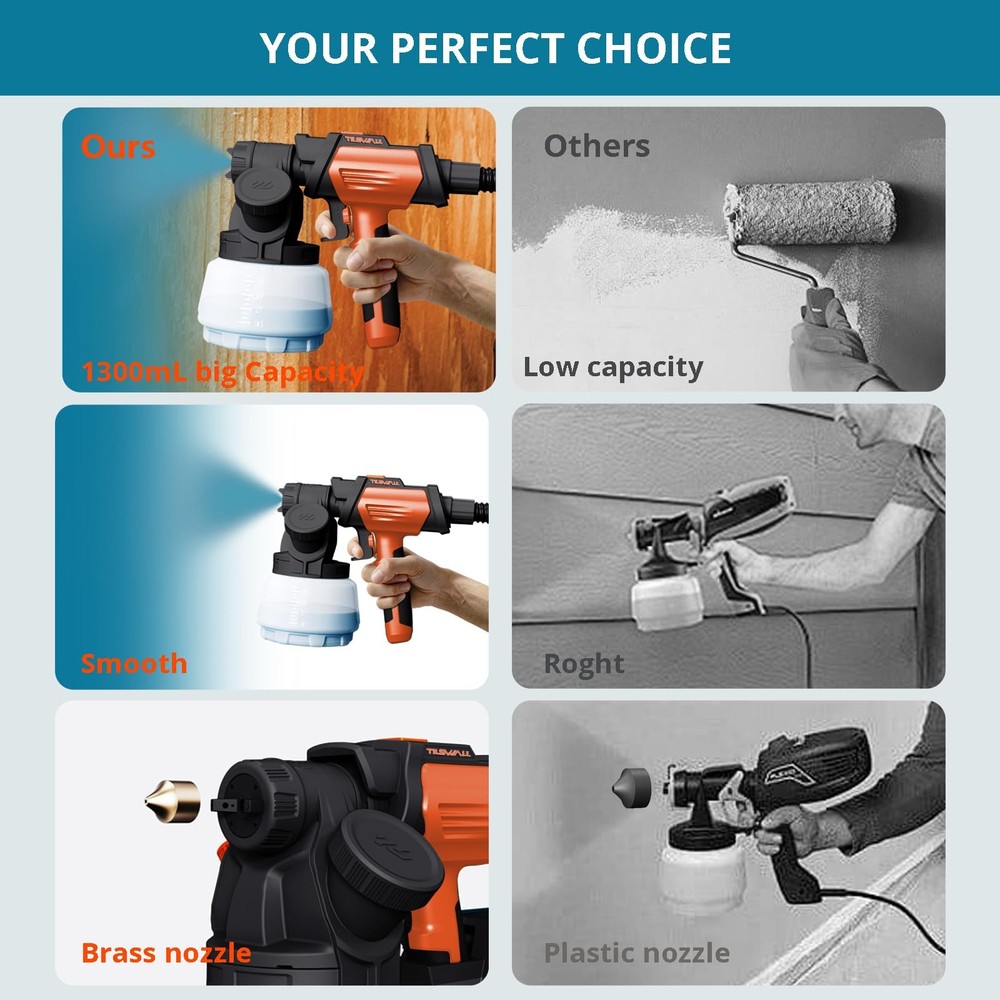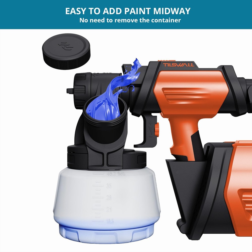 Tilswall Shark 800 Spray Gun, featuring a stunning new design that combines aesthetics with power. Equipped with an 800W high-efficiency motor, it delivers a spray volume of 1200mL/min, significantly enhancing work efficiency. With a maximum spray viscosity of 120 din-S, it's compatible with a wide range of oil-based and water-based paints. The gun's modular design, along with a convenient strap, minimizes hand fatigue, making spraying tasks much easier. A 2.5-meter air hose and 3-meter power cord expand your working radius, providing greater flexibility during operation. Additionally, it comes with durable brass nozzles in sizes 1mm, 1.5mm, 2mm, and 3mm, allowing you to choose from horizontal elliptical, vertical elliptical, or circular spray patterns to meet various application needs. Whether for professional jobs or DIY projects, the Tilswall Spray Gun is your perfect companion! 【Innovative Side Feed】The Tilswall Shark 800W paint spray gun improves the way you add paint. You can easily add paint from the side without turning the paint can, so you can make the most of every drop of paint easily and efficiently 【4 Nozzles and 3 Spray Modes】This electric paint spray gun is equipped with 4 brass nozzles (1mm/1.5mm/2mm/3mm). The larger ones are suitable for painting large areas and the smaller ones are used for detail work. It also offers 3 spray modes: horizontal oval, vertical oval and round. Ideal for spraying on fences, furniture, cabinets, garden tables and chairs, etc 【98in Hose + 118in Power Cord】The Tilswall 800w paint spraying system has a split head and main body design and an auxiliary strap to minimize the weight of the handpiece and facilitate spraying work. The included 2.5m hose and 3m power cord effectively increase the operating radius, making spraying movements more convenient and flexible 【High Viscosity Compatibility】Tilswall wall paint spray gun supports spray viscosity up to 120 din-S and is compatible with a wide range of paints (oil-based, water-based, colored). Its HVLP adjustable control knob regulates spray volume 【About Tilswall Spray Gun You Will Get】a spray can cover, a 2.5 meter air hose, 3 big seals and 3 small seals, 4 brass nozzles, 3 spray can shapes, a viscosity cup, a cleaning needle, a brush, and a needle If you have any problems with the quality of the paint sprayer within 1 year, please contact us, and we will try our best to find a satisfactory solution. We will try our best to find a satisfactory solution