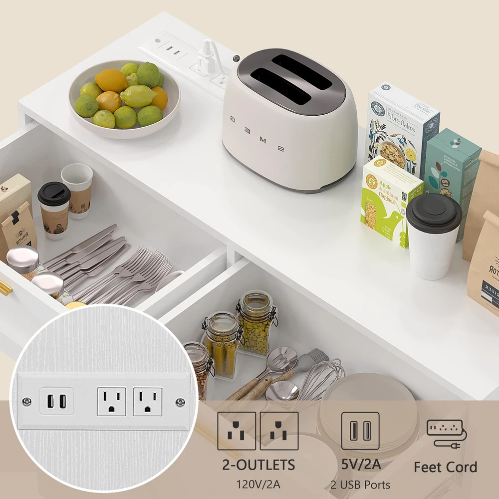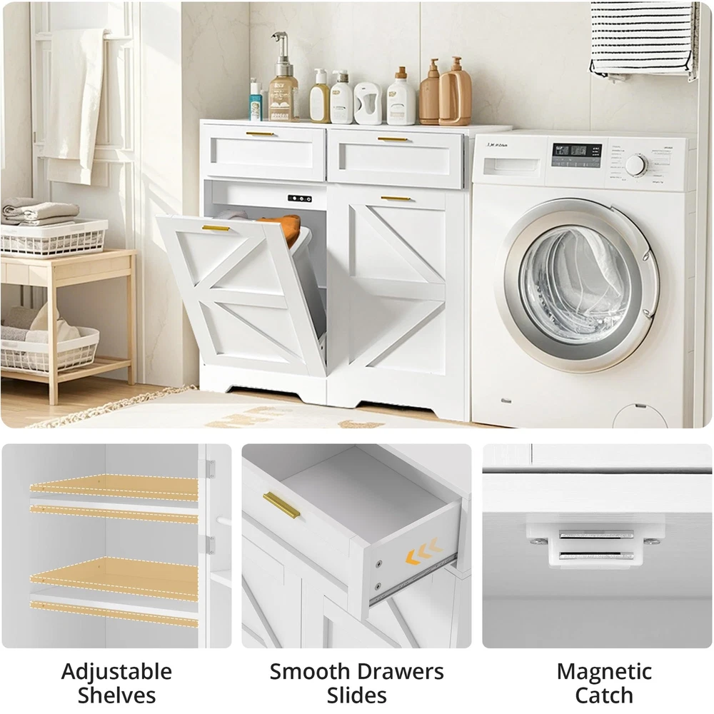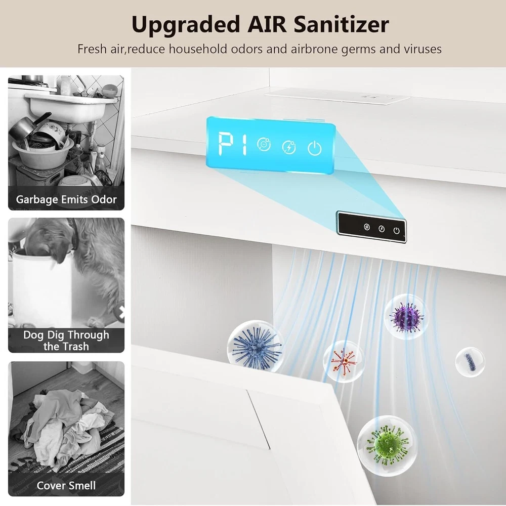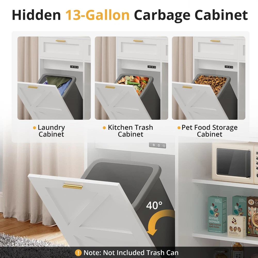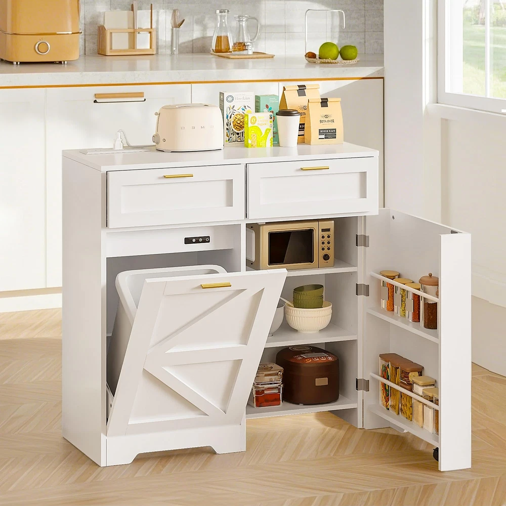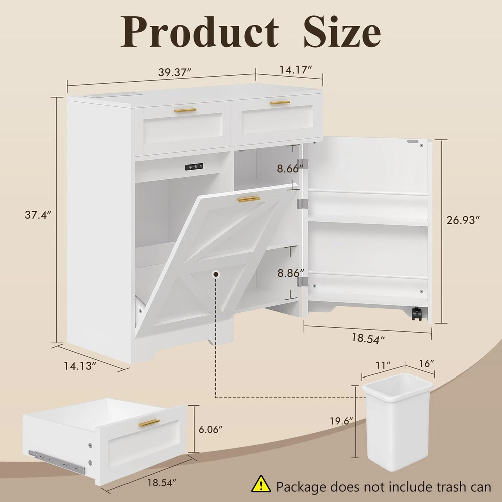 Product Description: Tilt-Out Trash Can Cabinet. Featuring a hidden compartment for a trash bin, this cabinet helps keep your space clean and clutter-free by discreetly storing waste. The spacious top can also be used for displaying decor or everyday essentials. Product Specification: Overall Size: 39.4'' x 37.4'' x 14.2'' Garbage Bin Size: 13 Gallon Packaging Size: 67.7'' x 19.3'' x 13.4'' Net/Gross Weight: 94.69 lbs Notes: 1.Package dose not include trash can. 2.Ensure that the cabinet is placed on a level surface to maintain stability and prevent tipping. 3.For optimal use, place the cabinet in a kitchen, laundry room, or other areas with moderate traffic. 4.Be mindful not to overload the shelves to prevent damage to the cabinet structure. 【Modern Garbage Can Cabinet】This simple wooden trash cabinet can be used as a kitchen island, a dirty cupboard or to store cat and dog food, and the top can hold coffee pots, coffee cups and more. It is perfect for brightening up the kitchen, laundry room, balcony, living room and more. 【2+2 Charging Design】: Trash cabinet includes 2 USB ports and 2 AC power outlets, supplying convenient power sources for various kitchen appliances. Its tidy multifunctional wooden countertop offers additional prep space, making it easy to organize and access all your kitchen tools. 【Exclusive Design Capacity】: Built to fit a 13 gallon trash can, tilt-out trash cabinet facilitates easy waste concealment while maximizing space, resulting in a convenient kitchen environment. (Trash can is not included.) 【Spacious and Secure】: Measuring 39.37 inches wide, 14.17 inches deep, and 37.4 inches high, trash can cabinet offers generous storage space with 2 drawers and additional shelves. The three metal bars ensure that your items are securely stored, providing peace of mind. 【Easy to Operate, More Durable】 Trash cabinet is made with sturdy 15mm P2 MDF side panels, enhancing stability and durability to support heavy loads for long-term use. Equipped with 360° rotating wheels, it allows for easy movement and operation.