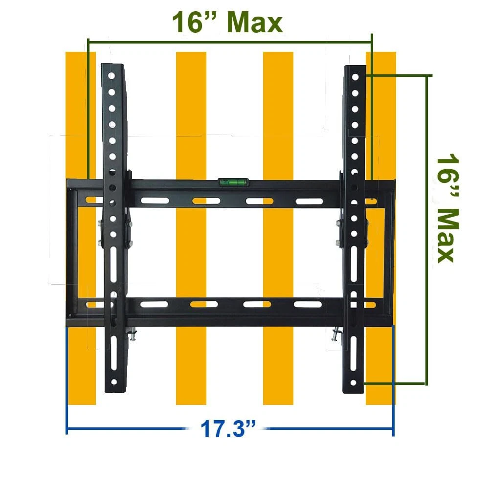 Will the mount fit my TV? 1. The weight of your display should be less than 66 lbs. 2. Please look at the back of your TV, find the mounting hole and measure horizontal and vertical distance , if the pitch-row is of the following data, then the bracket will work perfect for you. VESA: 400x400mm (15.7"x15.7"), 400x300mm (15.7"x11.8"), 300x300 (11.8"x11.8"), 400x200mm (15.7"x7.9"), 200x200mm (7.9"x7.9"), 300x200mm (11.8"x7.9"), 200x100mm (7.9"x4"), 100x100mm (4"x4"). Includes standard mounting hardware required to install mount onto wall. Common screws included to install TV onto mount. These included screws will fit 95% of TV on the market. If you TV requires special screws, they will need to be purchased separately from a hardware . Notice: This mount fits most 26-50" TVs, some up to 55 inch (please check mounting hole pattern and weight). Fit most 26-50" Display, some up to 55" (check weight and VESA) Supports up to 66 lbs (Triple Tested); Tilts down 10 degrees; Color: Black with VESA patterns 400x400mm (15.7"x15.7"), 400x300mm (15.7"x11.8"), 300x300 (11.8"x11.8"), 400x200mm (15.7"x7.9"), 200x200mm (7.9"x7.9"), 300x200mm (11.8"x7.9"), 200x100mm (7.9"x4"), 100x100mm (4"x4") Do not mount on drywall alone! Notice: Please check VESA mounting hole pattern, TV size, TV weight, wall stud location and possible blocked inputs and outlets before purchasing. Includes standard mounting hardware required to install mount onto wall.Common screws included to install TV onto mount. These included screws will fit 95% of TV on the market. If you TV requires special screws, they will need to be purchased separately from a hardware .