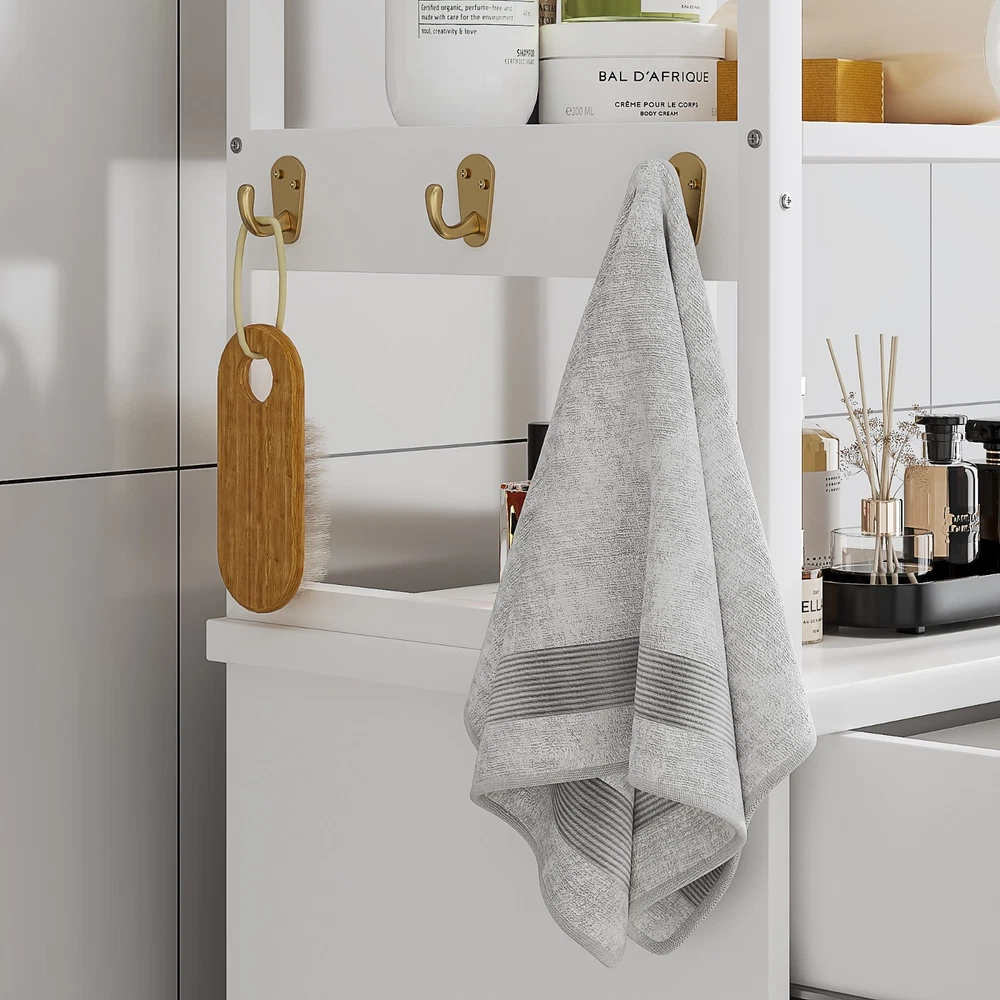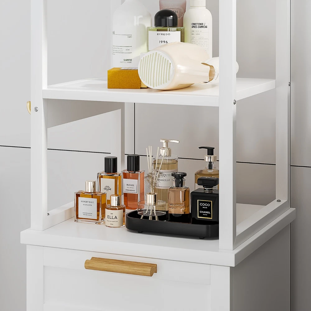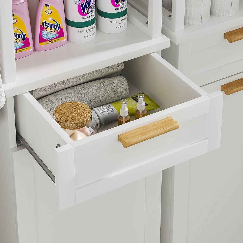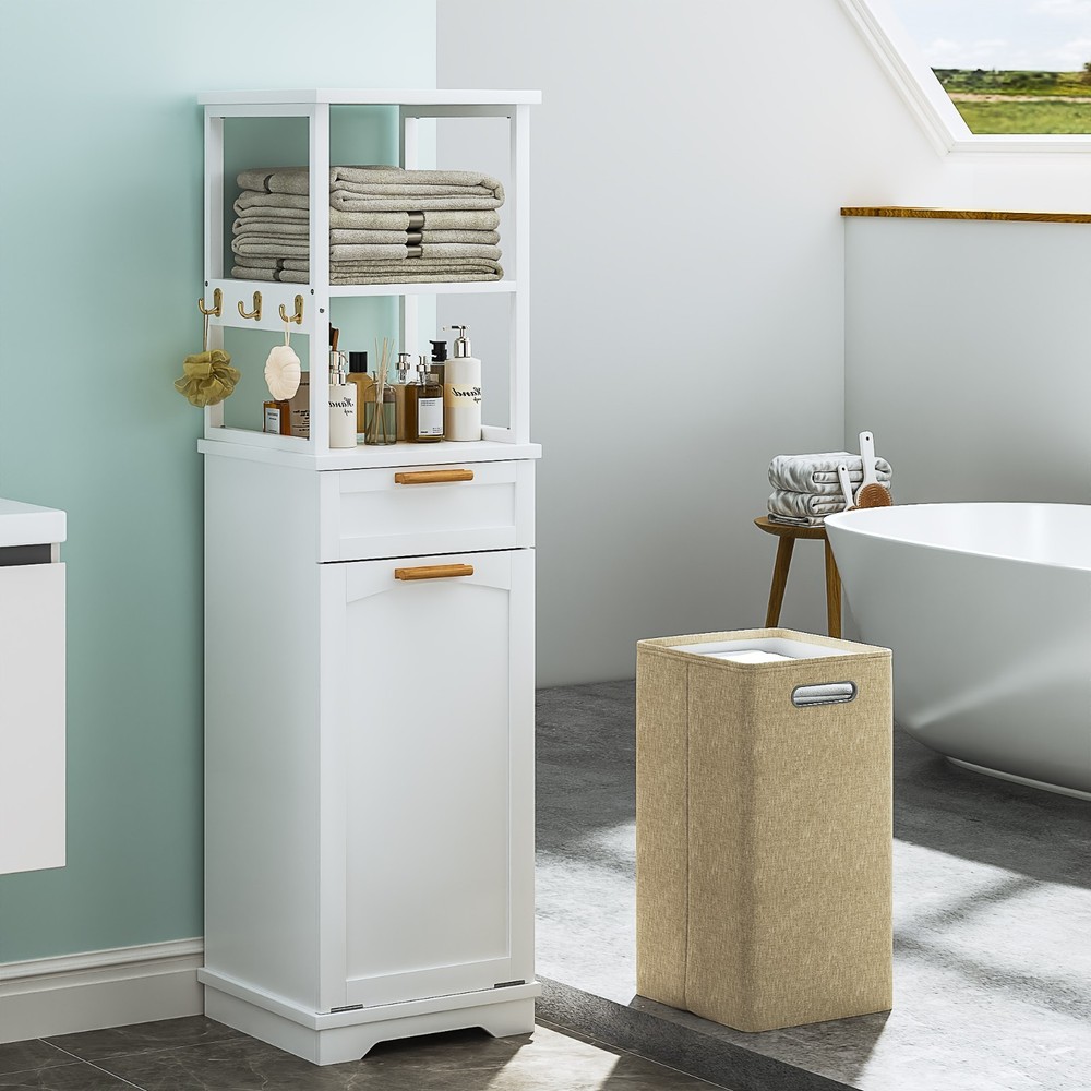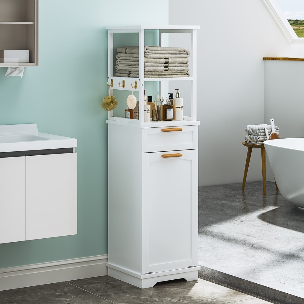Item Weight: 41.45 lb Required Tools: No Tools Required Item Height: 53.3 in Brand: VECELO Room: Kitchen Number of Shelves: 2 Assembly Required: Yes Type: Shelf Cabinet Manufacturer Warranty: 1 Year Country/Region of Manufacture: China Number of Drawers: 1 Features: Pull Out Trash Can, With Drawer, With Shelves, With Laundry Basket Color: White Department: Teens, Adults Item Length: 15.7 in Item Width: 13.3 in Material: MDF/Chipboard Set Includes: Doors, Drawers, Hooks, Laundry Basket, Shelves Finish: Smooth Door Style: Slab Mounting: Free Standing Style: Modern