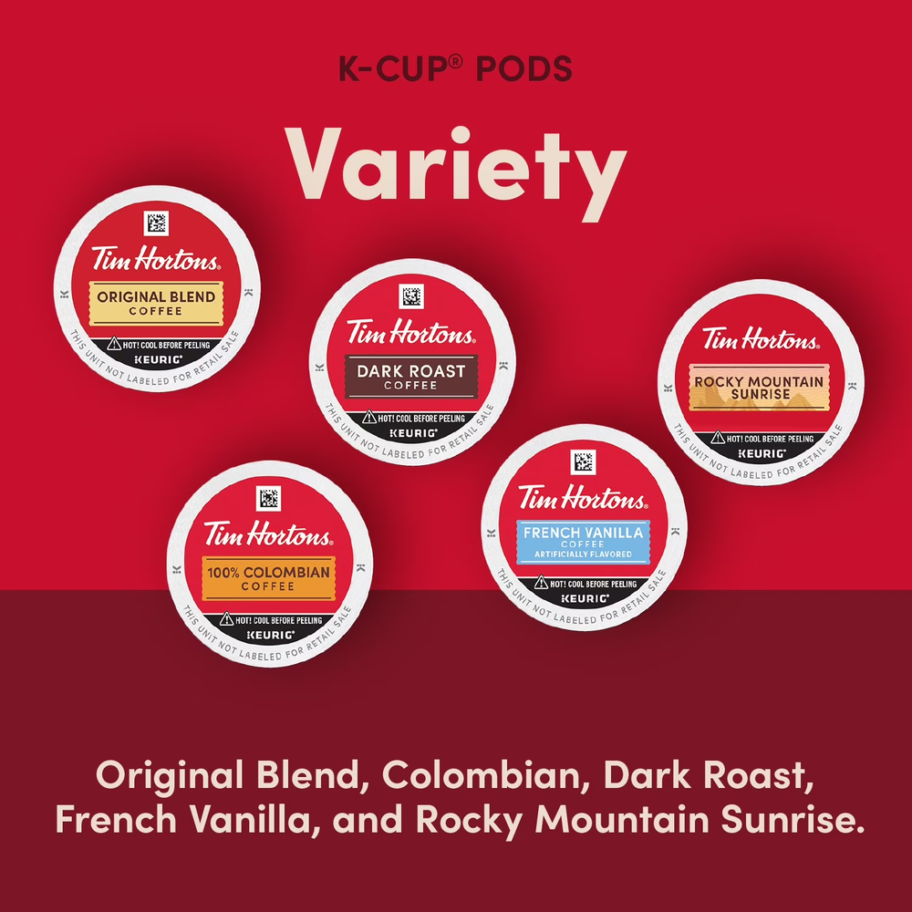 Product details Tim Hortons Coffee: A Legacy Since 1964 Since its inception in 1964, Tim Hortons has been committed to delivering an exceptional coffee experience. The brand combines artistry and precision in selecting, blending, roasting, and brewing coffee to create its signature flavor. Every cup of Tim Hortons Variety Roast Coffee is crafted using a unique blend of 100% Arabica beans sourced from the world's most renowned coffee-growing regions. Consistent Taste, Expertly Crafted Tim Hortons coffee beans are expertly blended and roasted with meticulous care to ensure the consistent taste that coffee lovers cherish. The recipe for Tim Hortons Original has remained unchanged for over fifty years, safeguarded as a closely held secret known to only three individuals. To maintain quality, the coffee team tastes over 500 cups daily, ensuring every brew delivers the same great flavor. Delicate Roasting for a Balanced Cup The premium blend of 100% Arabica beans is delicately roasted to achieve a perfectly balanced cup of coffee. With a Keurig Coffee Maker, you can enjoy single-serve coffee in just a few steps. Whether you prefer hot or iced coffee, black or with creamer, Tim Hortons coffee allows you to craft your ideal cup from the comfort of your home. Perfect Pairing for Your Breakfast Start your day with Tim Hortons Coffee, the perfect companion to your favorite breakfast treats. Whether paired with a donut, biscotti, or any breakfast food, Tim Hortons coffee offers a unique taste and quality that coffee enthusiasts will appreciate.