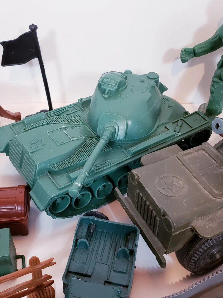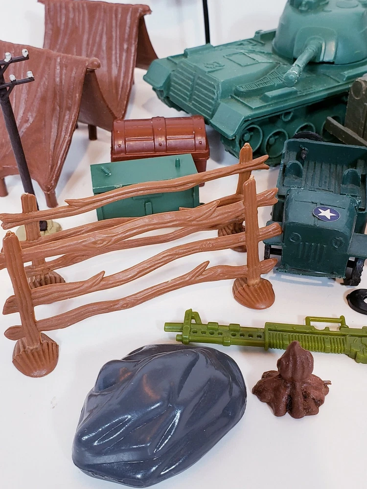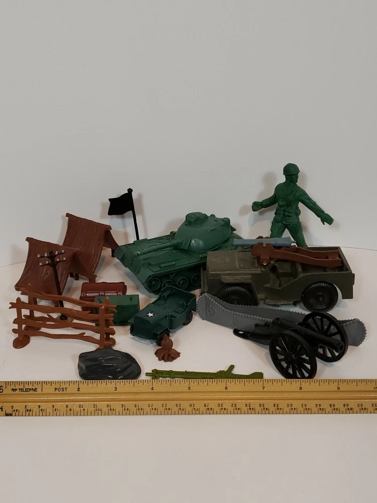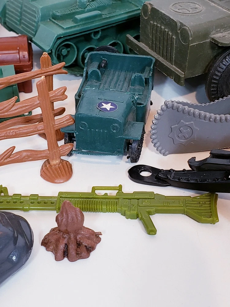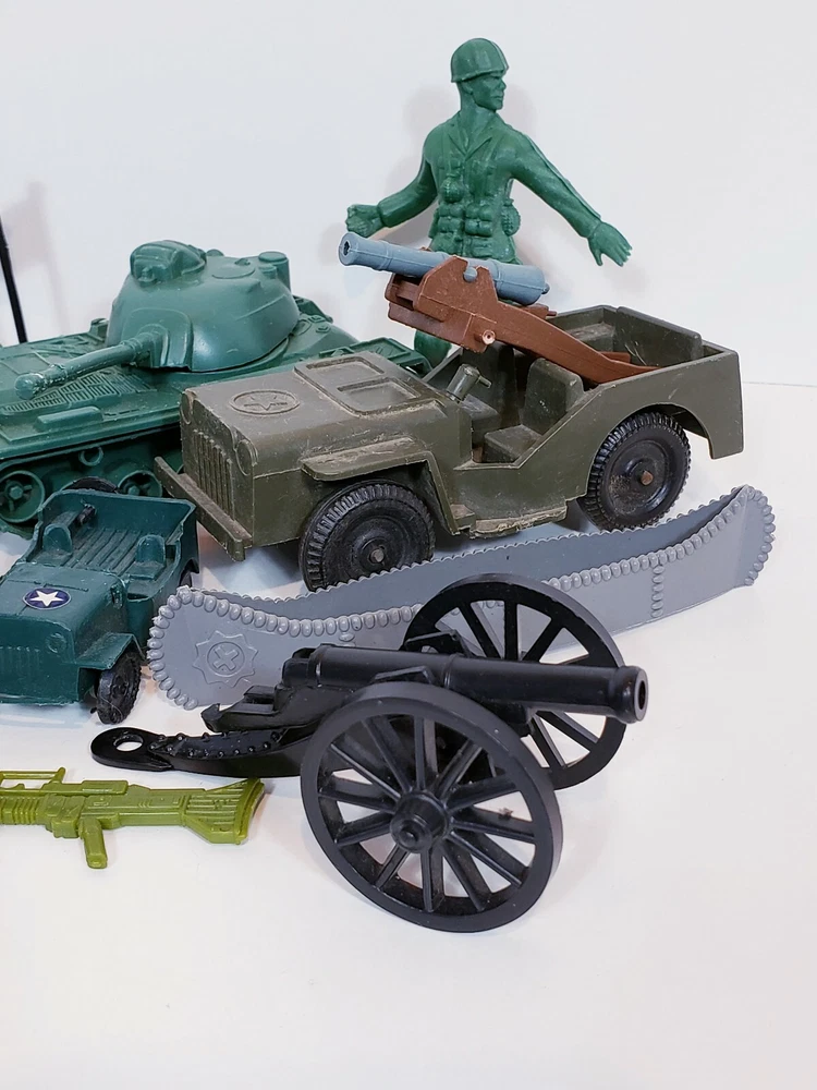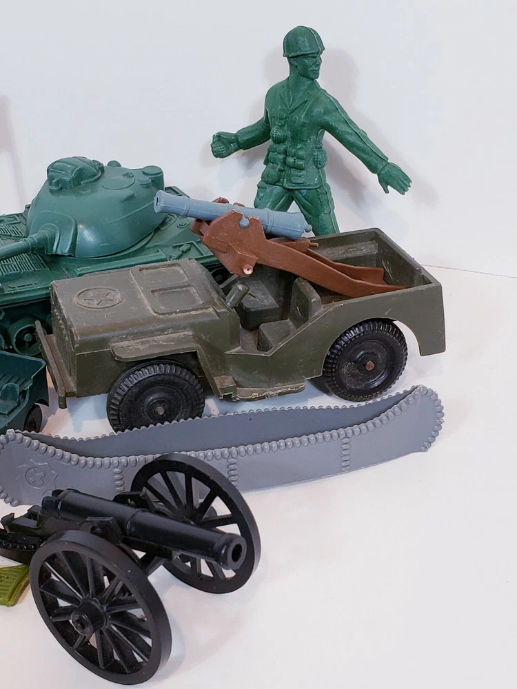 Tim - Mee Jeep Vintage Cannons Tank Tents Canoe Ammo Box Army assortment . Assorted plastic add on Pieces lot of 18 the jeeps steering wheel is missing some parts to the cannons are missing. Soldier is 4" in hight . It's a cool add on lot.