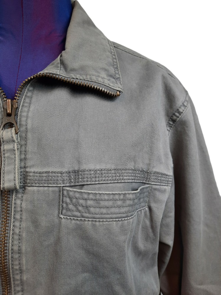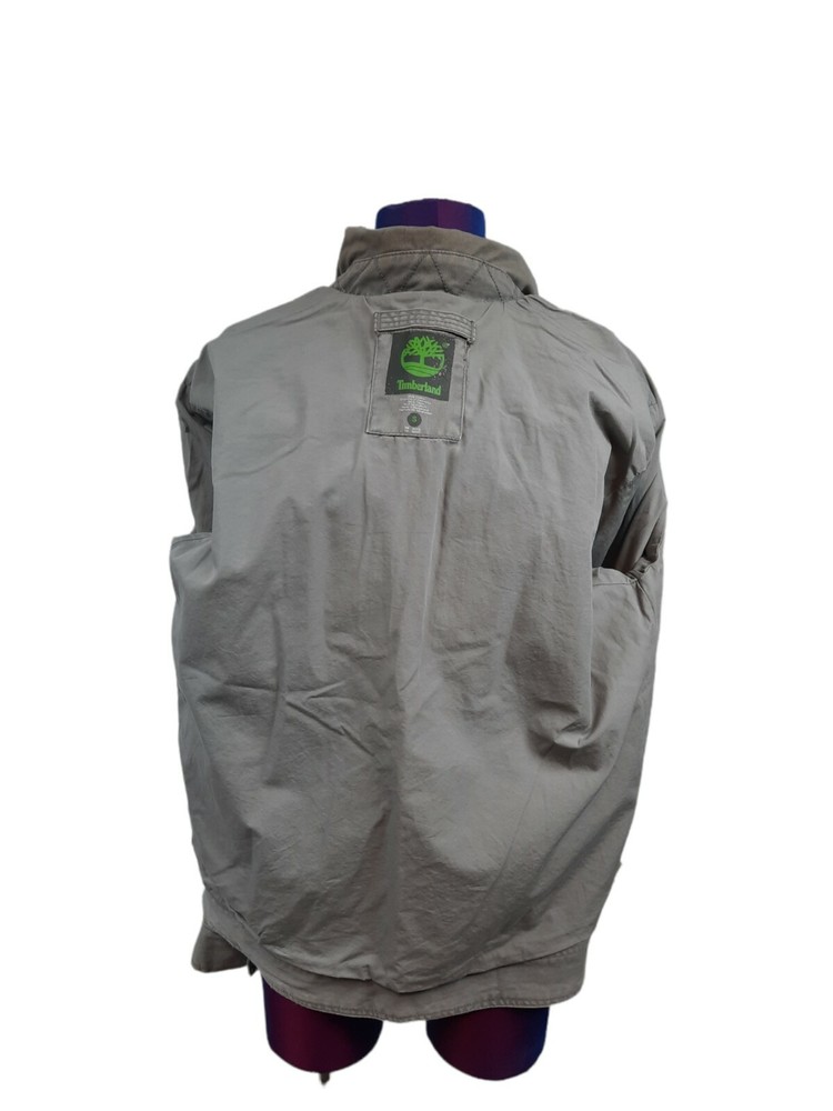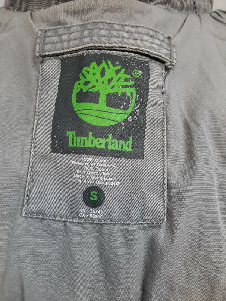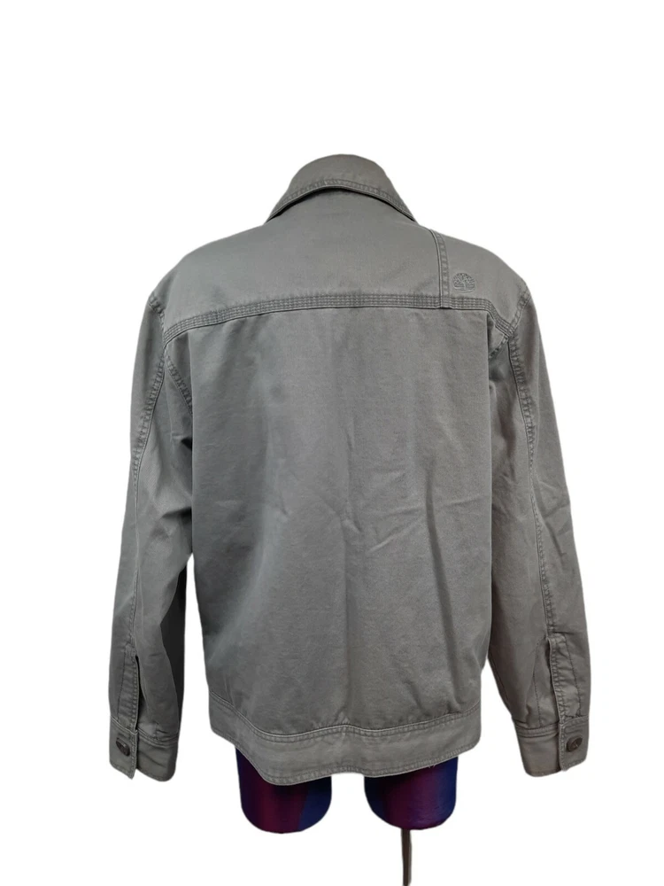 Timberland Bomber Jacket Gray Canvas Y2K Style Size Small Men's. In good condition Timberland Bomber Jacket Gray Canvas Y2K Style Size Small Men's. Features zipper closure, 1 chest pocket, 1 inside pocket with replacement button attached, 2 side pockets with snap closure, long sleeve with button cuffs, lined, heavyweight, workwear. Fabric 100% cotton Measurements laying flat chest 21" length 26" arm inseam 19" This is a pre-owned item that may show signs of wear. There are 2 stains smaller than a quarter on the base and in side of the jacket. The inside of the collar shows discoloration. Please see pictures for further details.